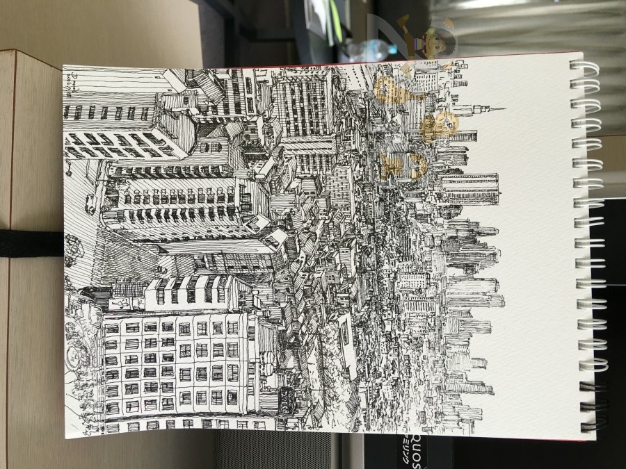癱在客廳可以隔著落地窗望著東京發呆,這是我認為此行最幸褔、最奢侈、最頹廢、最有意義的事。不管是清晨5:00起床後無法回籠;吃罷早餐等著家人準備妥當出門;逛累了提早在日落前回到落腳處...我都會拿起0.4mm的黑色原子筆繼續這張事後讓我最滿意的東京鳥瞰圖。如果,不是整個旅程都定點住在這裡,我鐵定無法花一半以上的日數完成它。