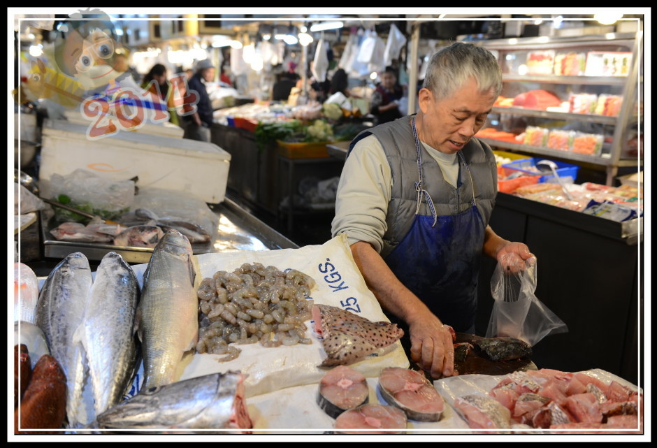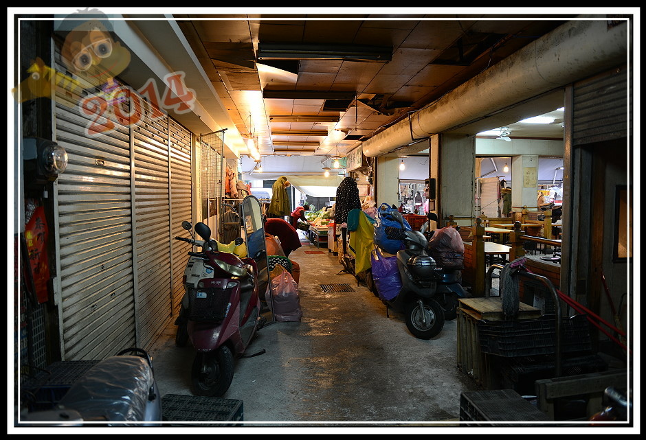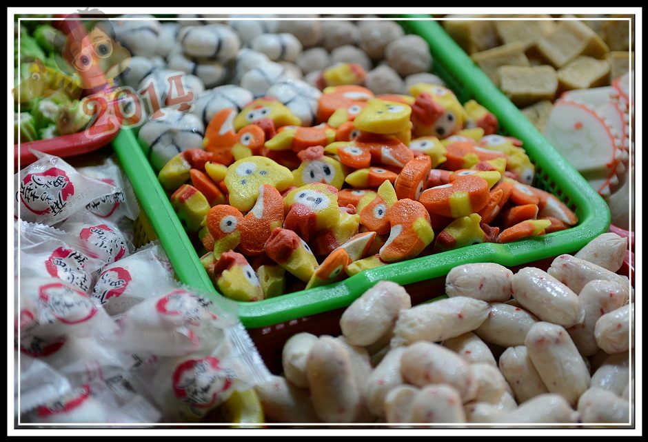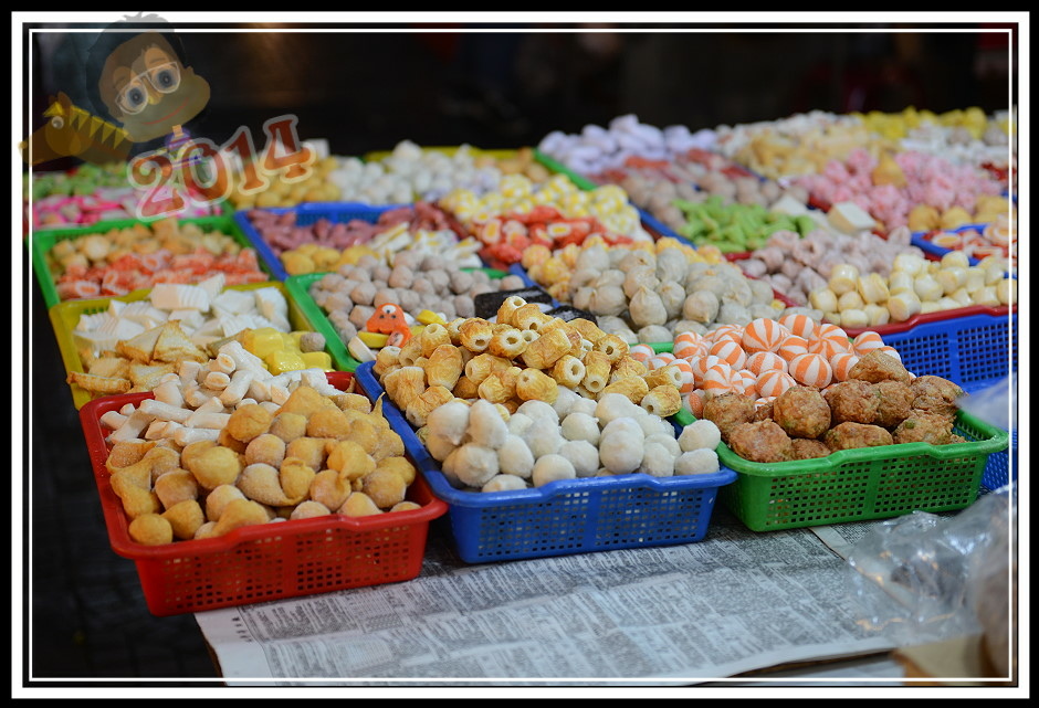 我沒想過火鍋料也可以自成一格,口味、形色繁多。在蔬菜攤旁...專賣火鍋料的攤子擺滿各式各樣的鍋物,有些色彩鮮豔,簡直與糖果屋的擺設不分軒輊,甚至捏成動物造型。如果家裡有小朋友,買這些回家鐵定讓它們食慾大開。可惜,台灣食安問題實在太嚴重,我們家早就不太吃「看不見原形的食物了。趁著老闆彎下腰到冰箱一包一包地取出原料之際,迅速端起相機偷拍,單眼相機就有這個好處,開機快、對焦快、快門快、不需要閃光燈。我相信在傳統市場擺攤的老闆一定不會吝於將他的貨品借我拍攝,只是...跟他搭訕的時候我真不知道要說些什麼?談食品添加物?談色素?還是講近來的食安問題?