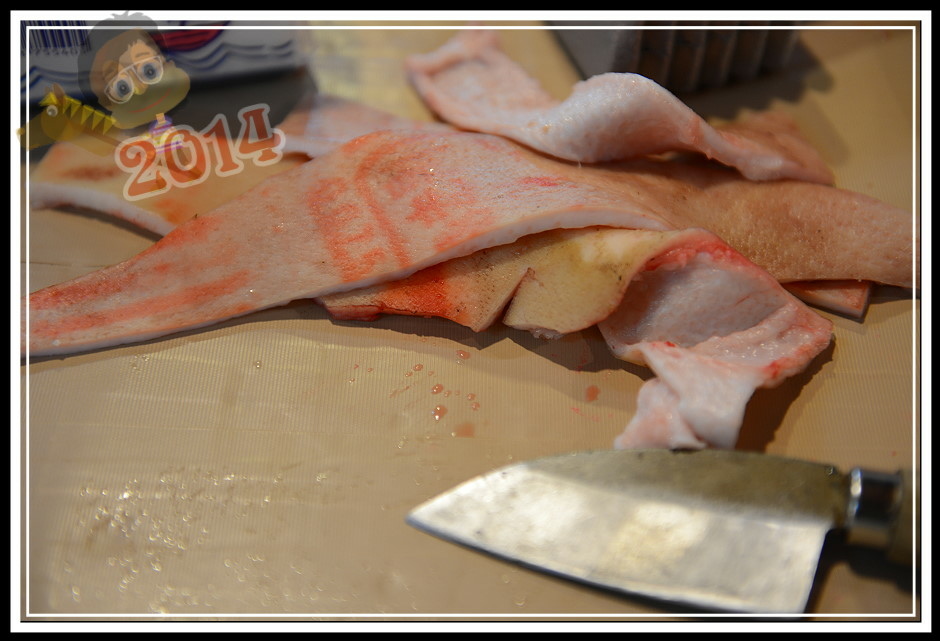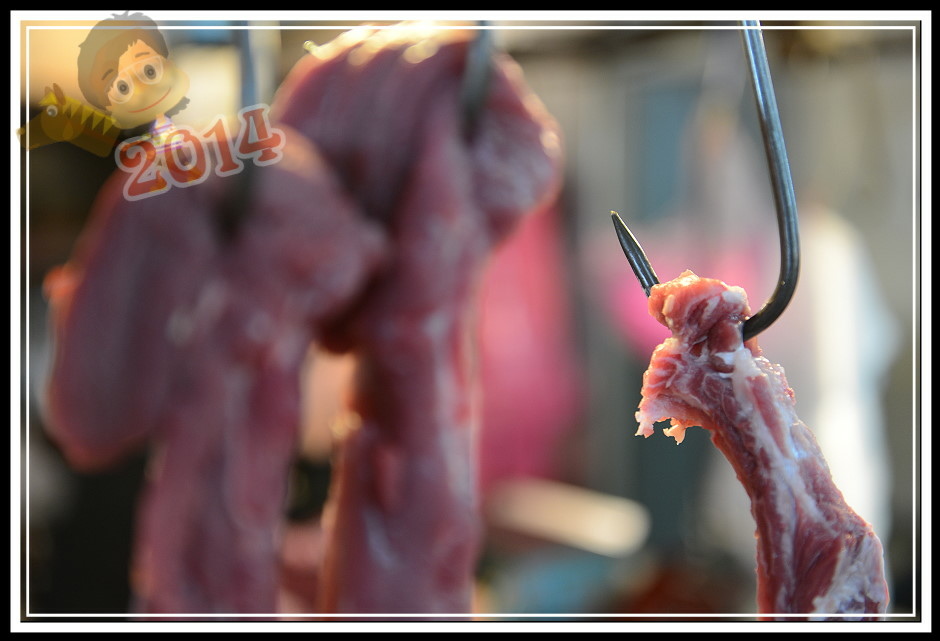 年輕的老闆娘負責接電話與客人應對,依照要求處理肉塊的大小與種類。老闆娘的娘則在一旁處理豬肉上多餘的油花,前天公共電視台裡為了功夫走天下的節目就播出一位小女生到新加坡的餐廳實習,廚房裡有個工作就是去除油花,在牛肉要下鍋煮之前,廚師就得拿著尖刀好好整理一下牛排。我以為老老闆娘這樣的處理,也讓她賣的豬肉高級了起來。