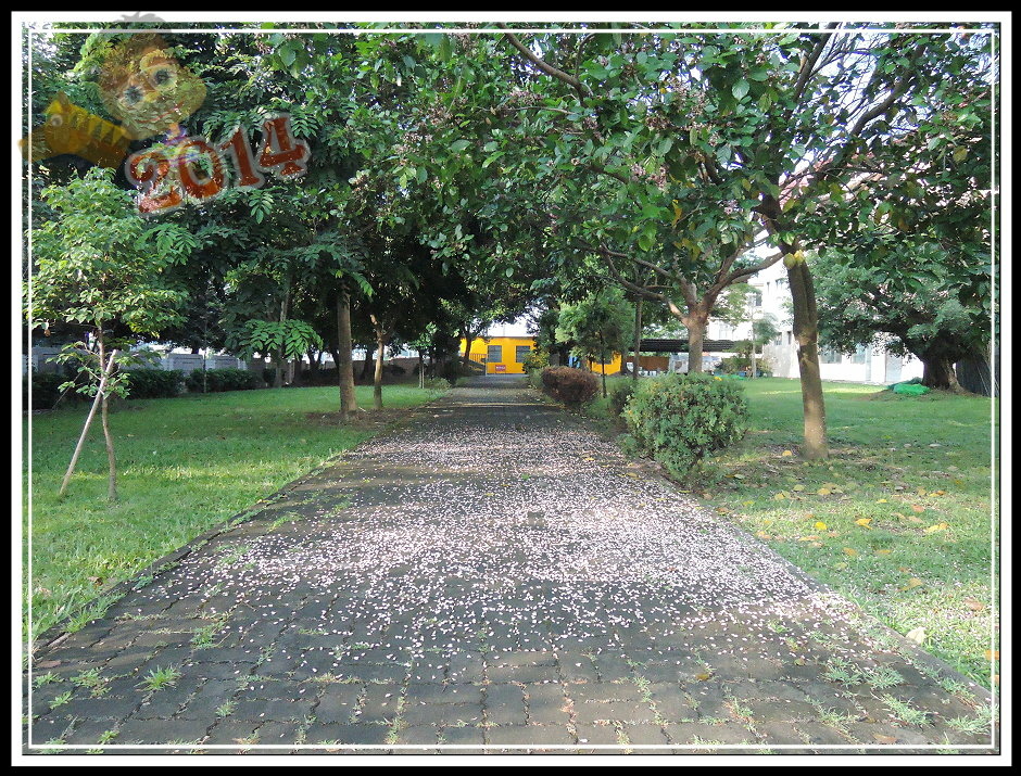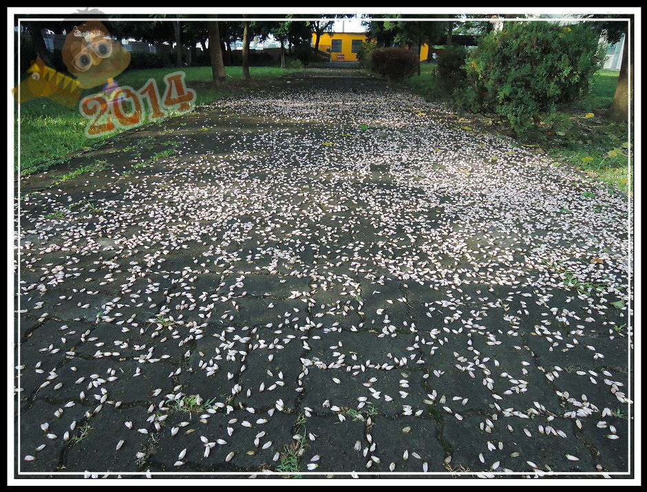 看見老師正指導著孩子努力揮舞著竹掃把清走落花,忍不住靠近老師身邊,輕輕地央求:「不要掃,可以嗎?」因為,我剛剛還專程趁隙從大門口跑過來拍了滿地的落花,還來不及再仔細取景。老師眼看著孩子,反問我:「可以嗎?我會不會被檢討?我已經猶豫好幾天了,每天都要掃掉一片...好可惜!」