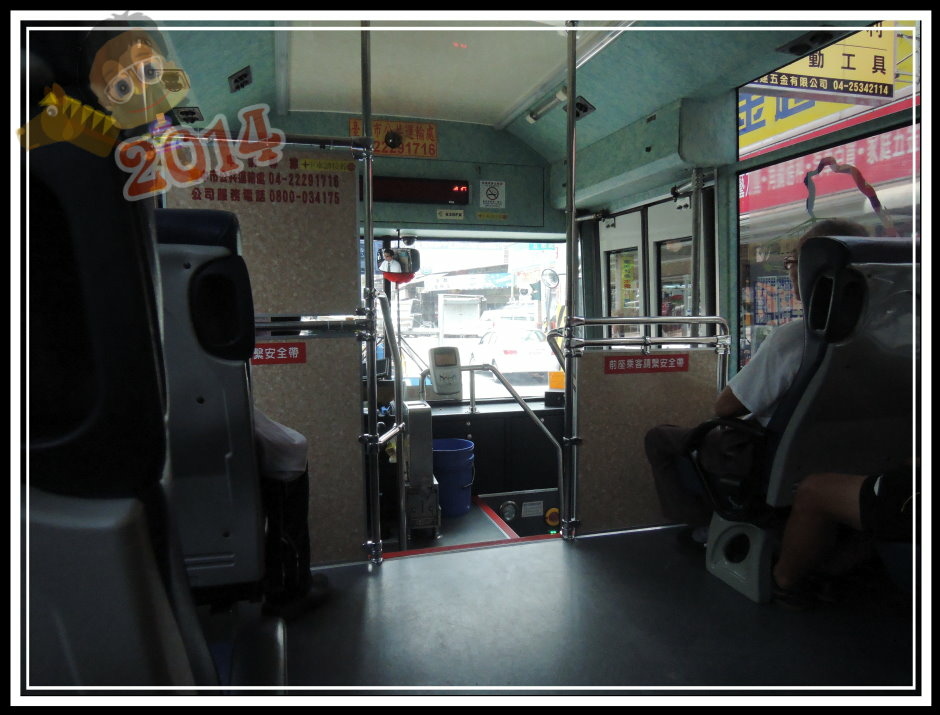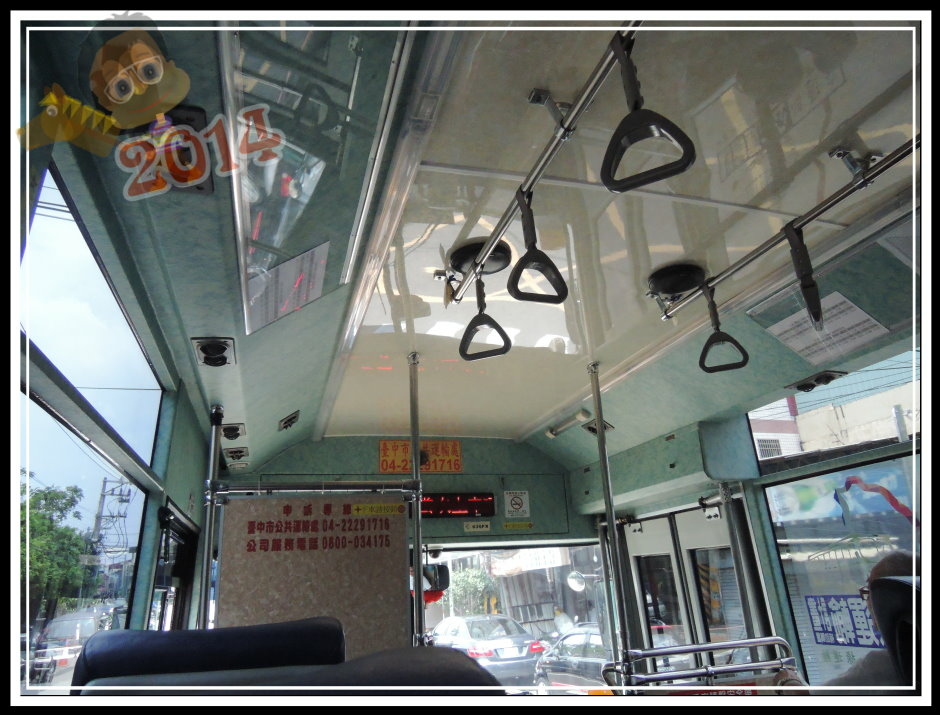 貼了第一張照片,又「翻」出資料夾裡另兩張前幾天由學校進市區預定120色水彩色鉛筆時拍的公車內部。那天,意外地搭到這就款公車,上車需先爬上三階又高又不貼心的階梯,才能站在貫穿車頭車尾的平整地板上。車子內部已經被「公車思維」感染,兩邊以前常見的雙排座椅已經撤去。我往前方拍了兩張,其實也想回頭,只是今天搭車的乘客都面無表情,生恐回頭拿起相機,會拍到一群以手、書遮臉的畫面,於是作罷了。