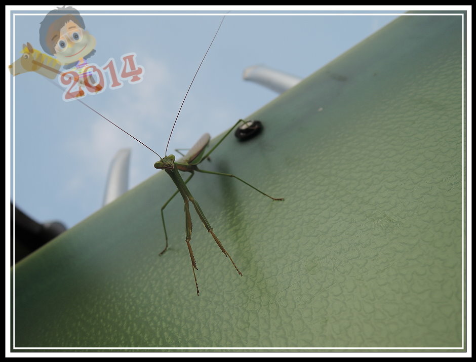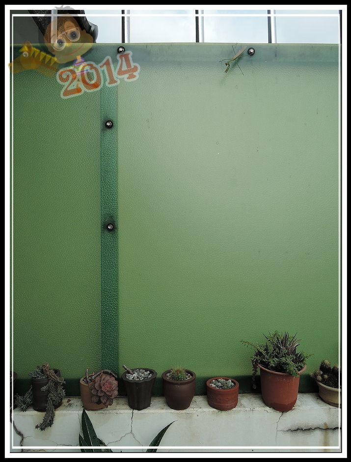這露台花園雖然一向有機經營,但平素除了螞蟻、蚜蟲、青條花蜂出沒...了不起就幾隻毛毛蟲出現,對大螳螂這種掠食昆蟲實在不是「發展」的老地方。況且白天麻雀常來巡遊,入夜之後更是蝸牛與壁虎的天下。牠為什麼來?如何來?著實令人好奇。