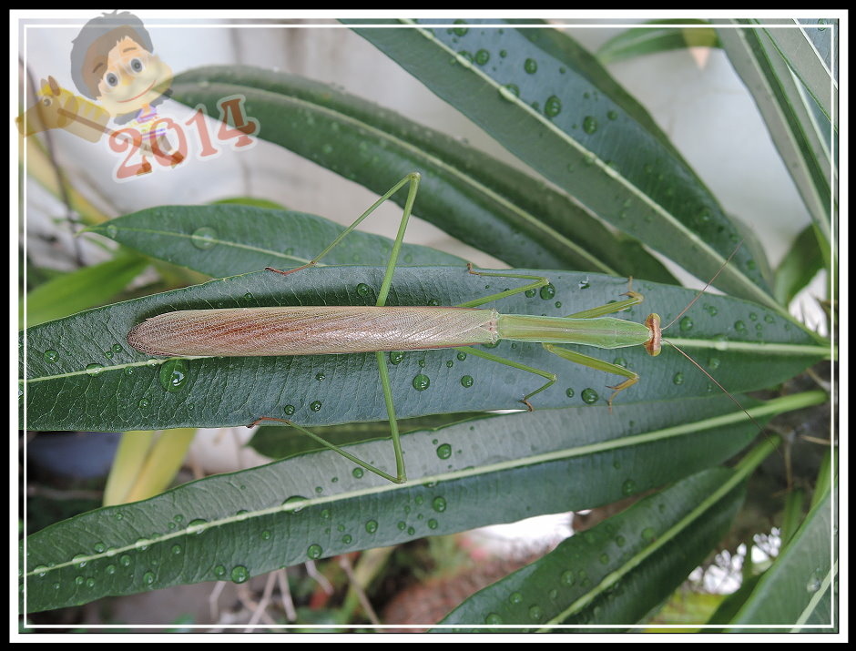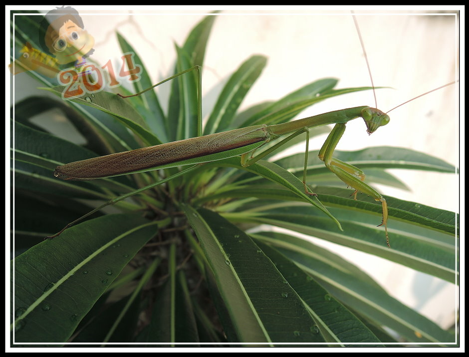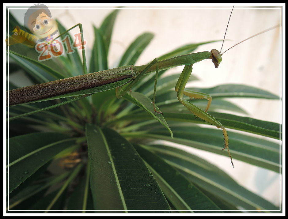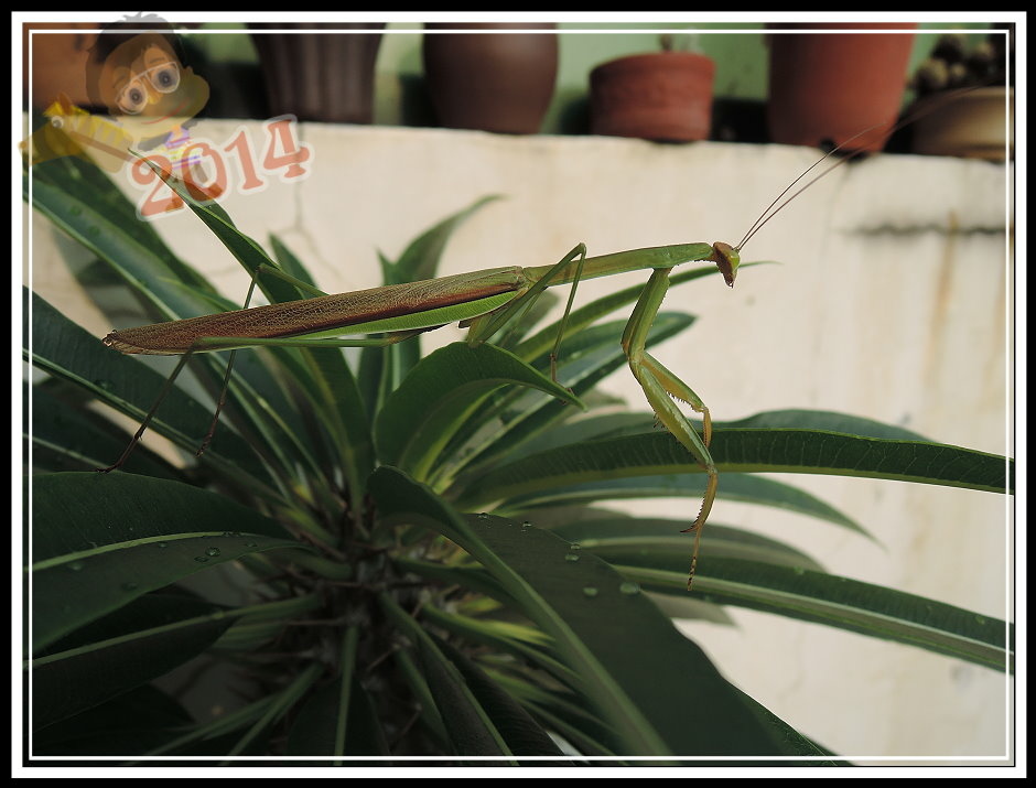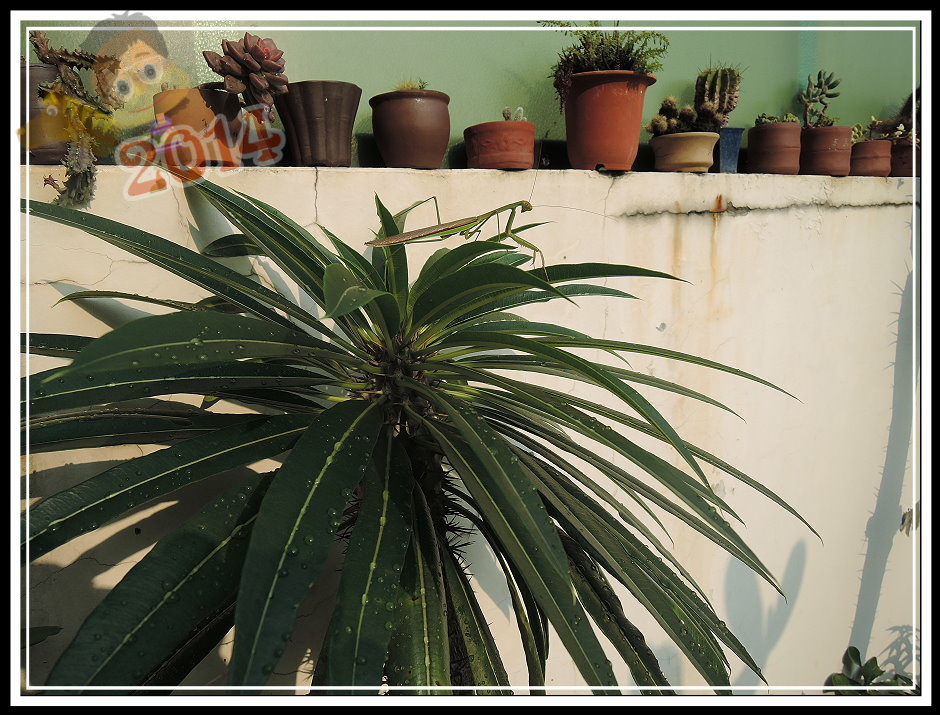 星期天,澆水澆到非洲霸王樹,忽然一隻身長約10公分的大螳螂從葉子背面現身,彷彿是被冷水給打擾了白日夢。他一現身就張牙舞爪,四處張望,一副想找驚動牠的小廝算帳。