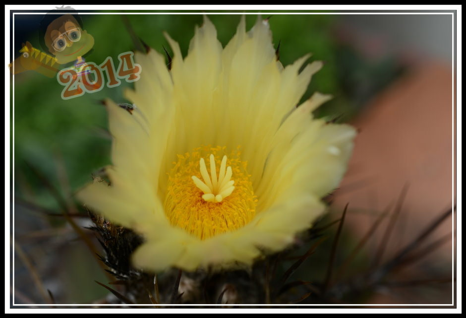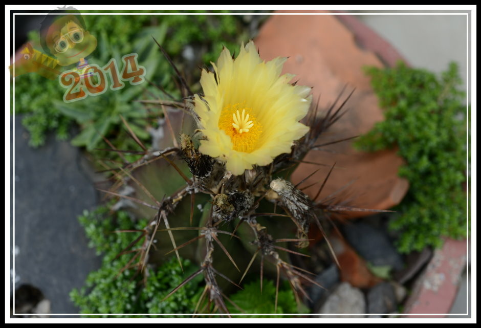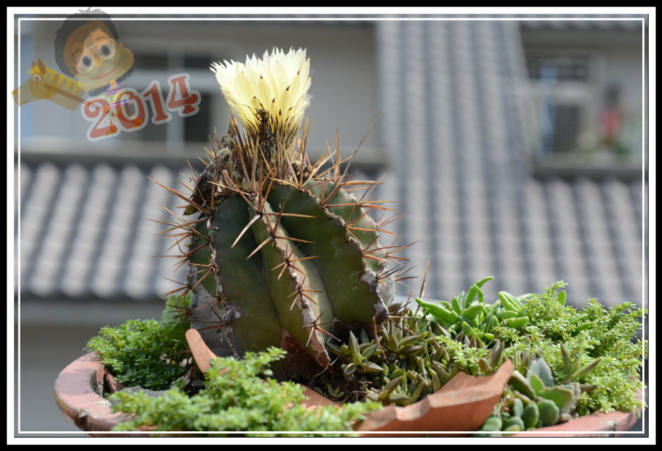 比起金晃丸,般若開花就沒那麼稀奇...我談的般若是 Astrophytum 屬的仙人掌...,每到初夏季節,般若就開起美麗的「大黃花」。般若,被我放在露臺的女兒牆上,靠著老天與懶惰的我照顧,但...說實話,老天比我盡責多了,於是乎比起般若不夠強韌的小葉冷水麻、紫花酢醬草雖然站到花盆裡,卻始終不能霸佔全局。