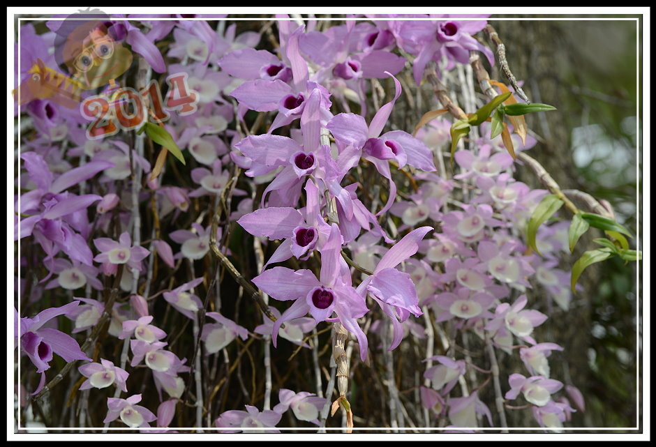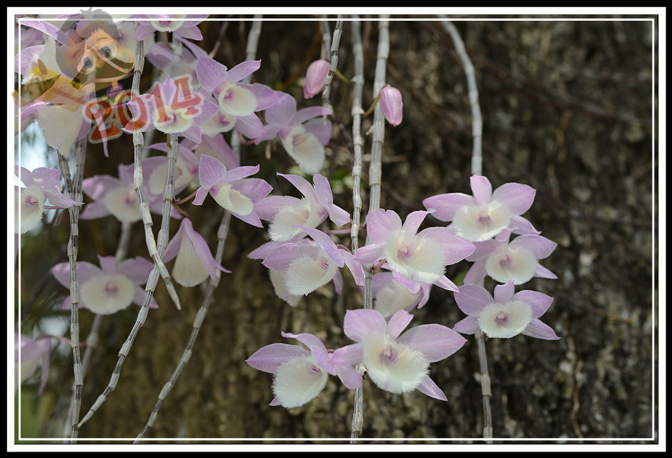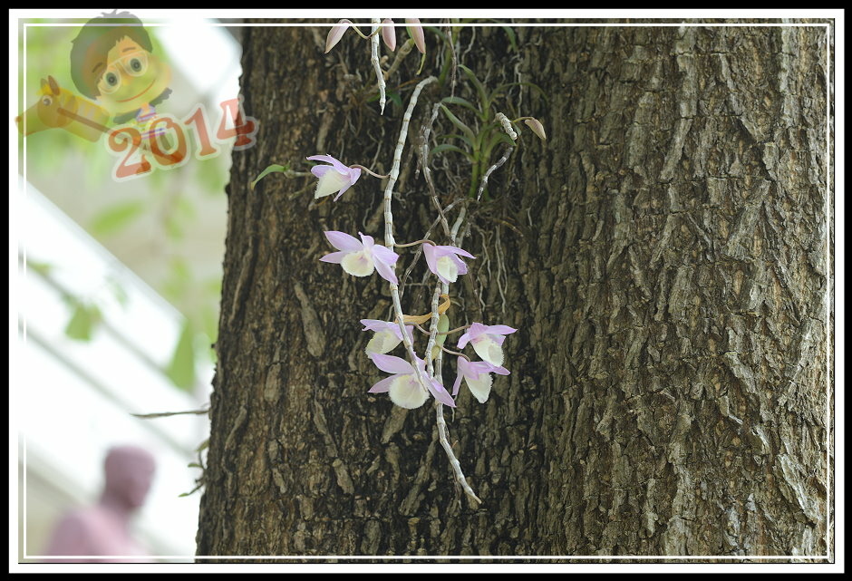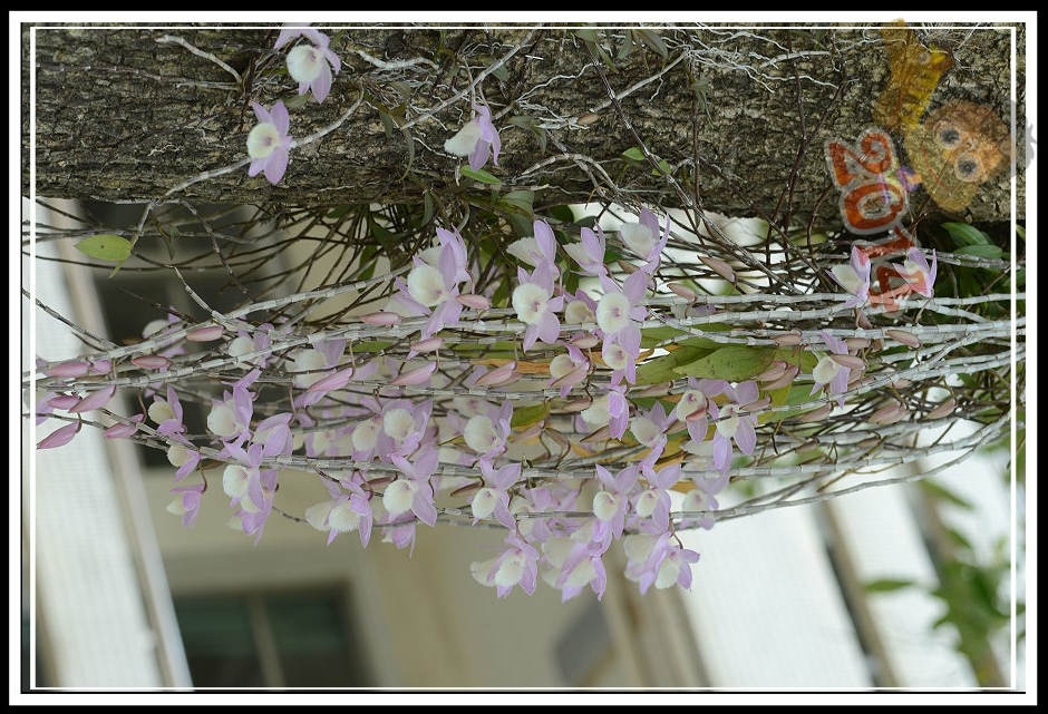 簡單地剪下幾隻禿枝,用釘槍釘緊,它們就在黑板木粗糙的樹皮上生存,每年準時地綻放。春末花開,石斛蘭們異於其他蘭花慢條斯理的方式,在上週五稍稍初現端倪,今天上班就已經繽紛成這副模樣。日本人喜歡櫻花集體的盛開、集體的凋謝,在我看來...天宮石斛蘭這種功力也不遑多讓。約兩個星期吧,這些花也會集體凋萎,留下禿枝。然後在每根禿枝的基部開始冒出芽來,長出將於明年開花的新植株。而禿枝則會在節間冒出不定芽,伸出氣生根,附著住介質後再更往後的年裡開花。有時候,枝條因為風的吹盪,附著不了,禿枝會慢慢地釋放盡養分然後乾癟。所以,有些人會將禿枝剪下來,綁附介質讓他發展成新的花株。我喜歡拿著釘槍再將禿枝上的不定芽反其道地固定到親株上方,讓石斛蘭擴張地佔領更多地方,在來年開得更加繁盛。