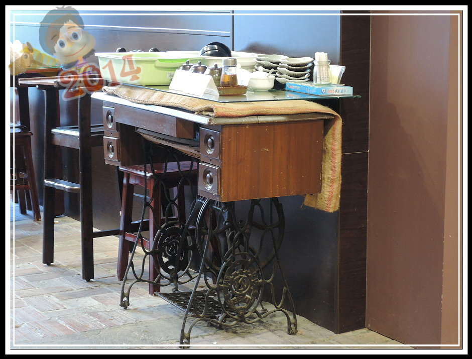 以舊時的縫紉機擺在角落裡取代擺放碗筷的小几,與小吃相互輝映,頗有懷古之情。
