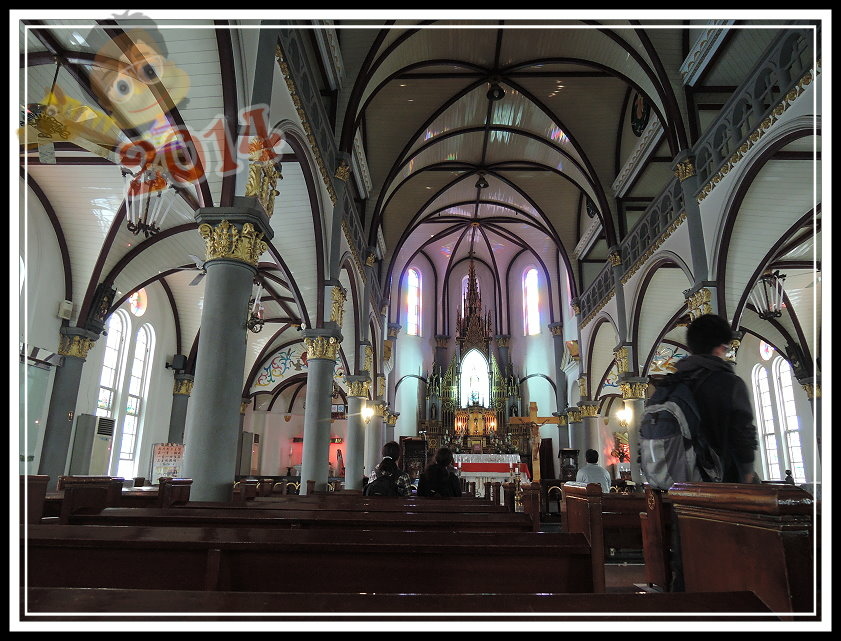 後來,又利用寒假到高雄,就住在苓雅區的飯店,徒步到真愛碼頭,必須天天經過教堂門口,還是忍不住進來感受那莊嚴的氣氛。那段時間,湊巧遇上高雄燈會揭幕,教堂也以彩色燈光裝飾,我看來...活脫就是燈會最精緻的大型花燈。