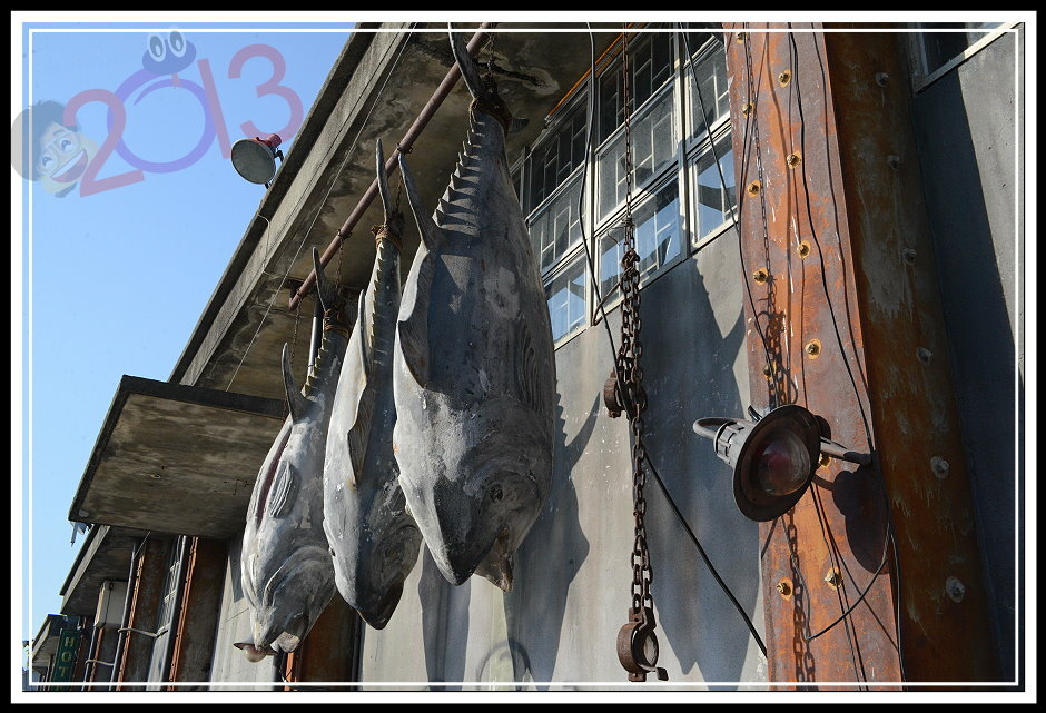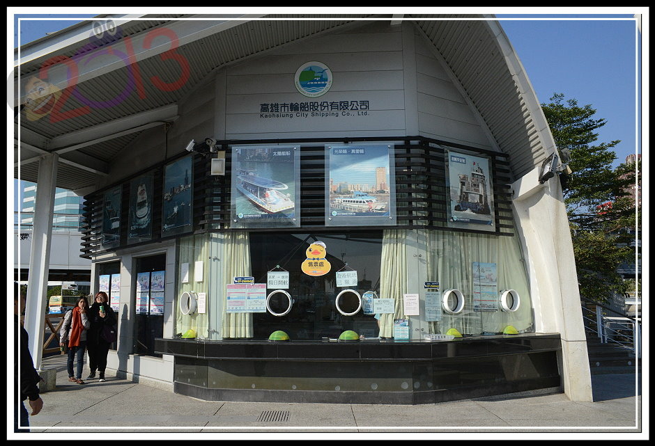 只好往駁二特區走過去,碼頭邊停著海巡艇,以及台灣大學、中山大學的研究船。沿著碼頭邊與倉庫間鑽去...,有間酒吧,外頭倒懸著三頭鬼頭刀...有條巡遊紅毛港的遊艇正在上客,發覺這裡遊港的船還真多,但遊客更多...我們應該是倒著逛,摸進了船邊,卻始終找不到賣船票的櫃檯。於是...再往前走,在倉庫間裡發現像極了車站售票口的地方,透過透明的玻璃往裡看,與現代化的售票亭實在落差很大...,裡面坐著一位婦人,見我張望也不主動搭理,兀自地做她的事...我環顧一下玻璃窗...有點舊但的確是遊港的售票處,但船呢?該不會是舢舨吧?