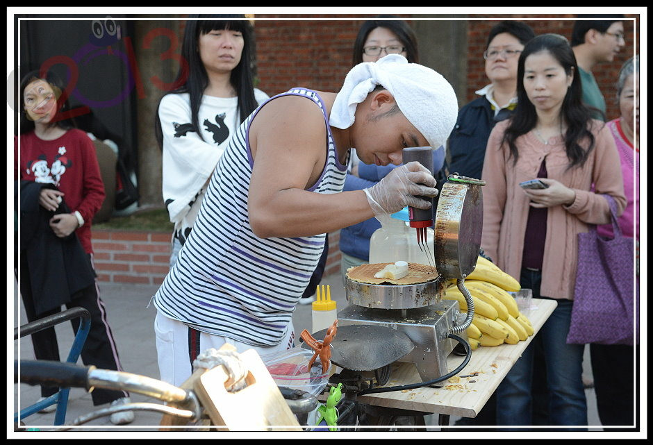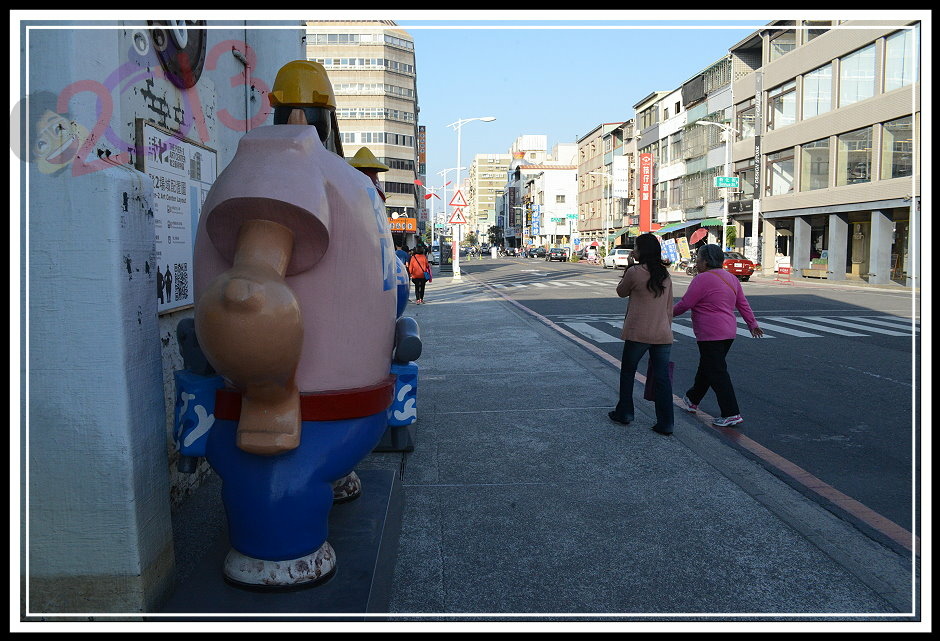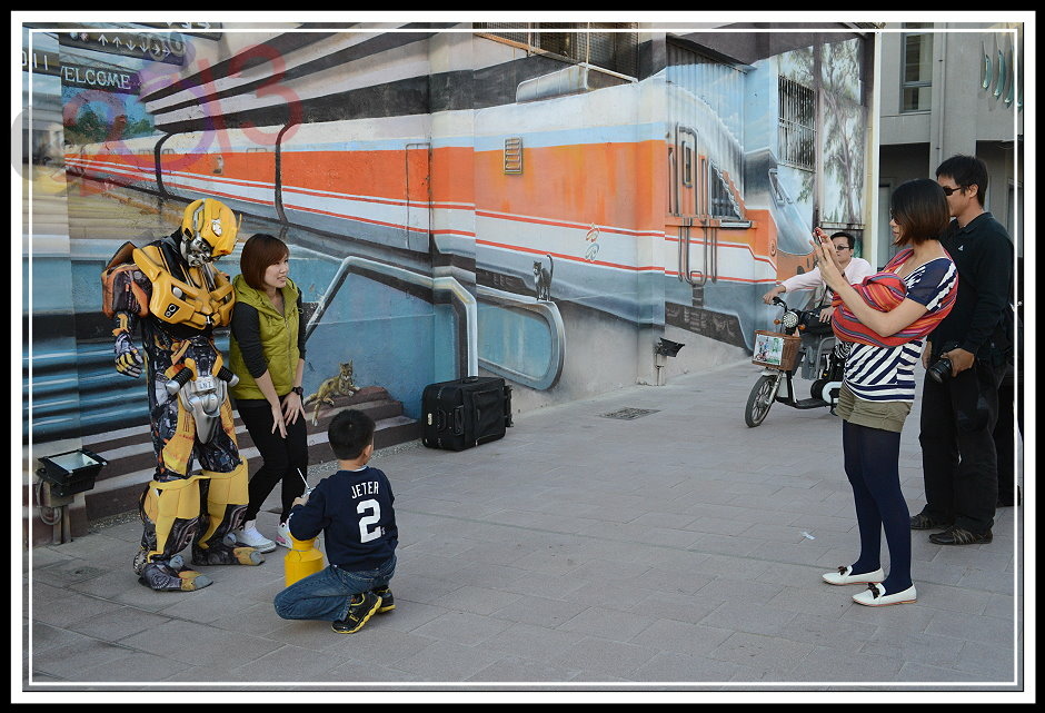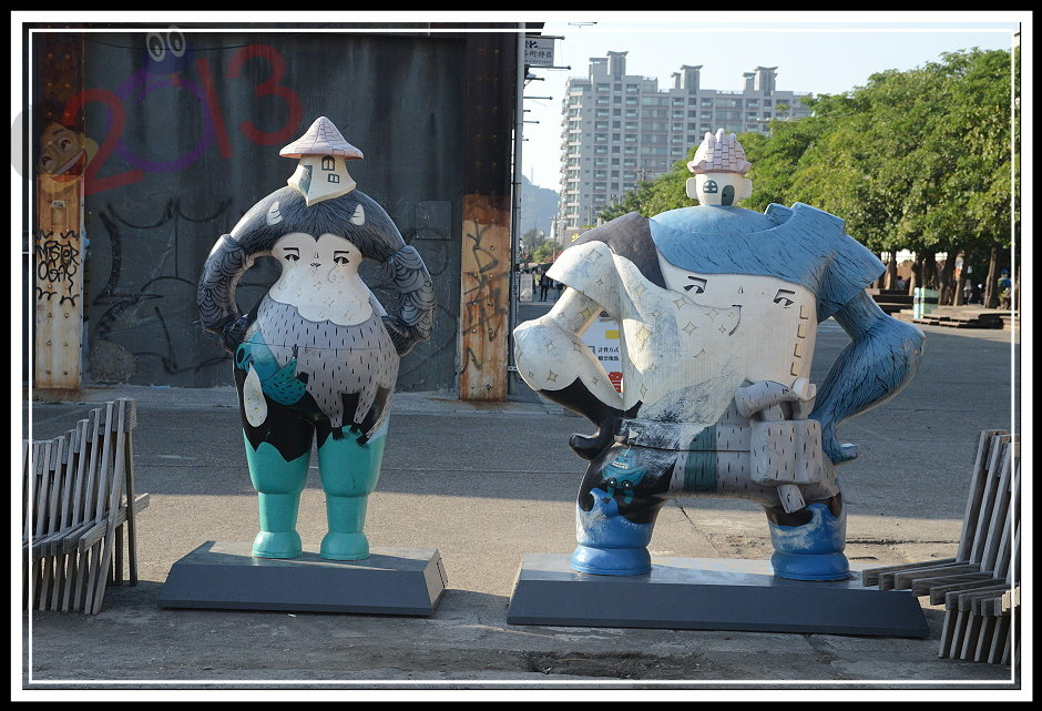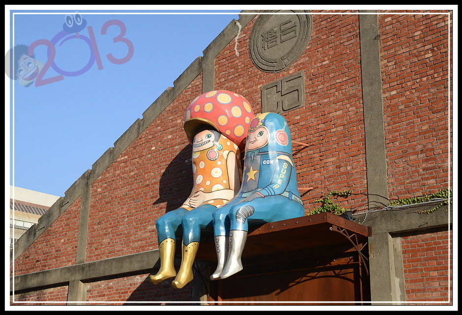 逛了特展、文創攤位、聞了香蕉餅、與機器人合影...末了拍了坐在台糖屋簷上的兩個人偶...我本來想和它們合影的,可惜它們坐太高了,我腿短上不去。