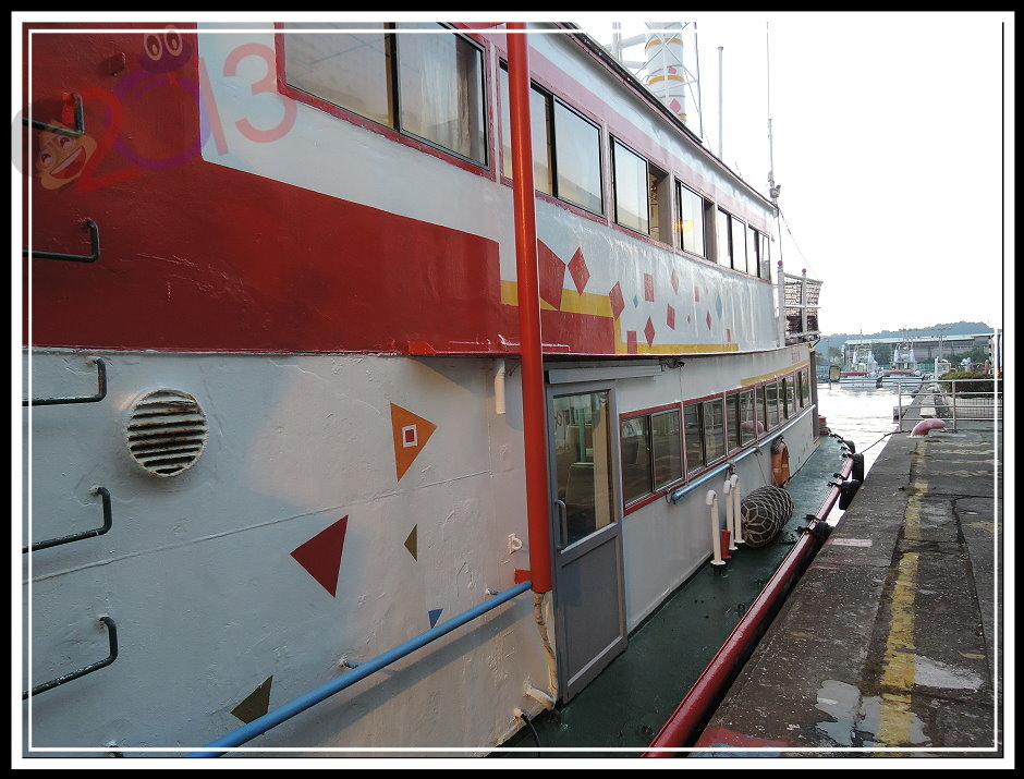 心一橫,湊近售票口問說:還有船開嗎?這時,婦人才抬頭說:「有啊!」「在哪?」「後面那一艘!」原來,就是我們剛走過來拍照,漆得像兒童遊樂船那艘。