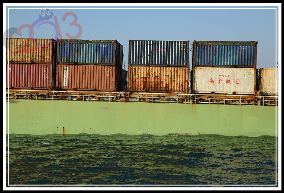 大量的自動化讓我們從低處不容易看見船員,偶爾在船側發現,更襯托出船隻的巨大。不知道這樣的貨輪可不可以攬客?搭這樣的船隻遠渡重洋,鐵定倍感滄桑。