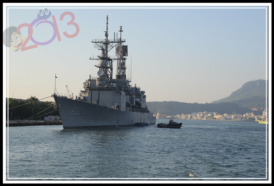 繞過軍用碼頭,號稱全台最有戰力的紀德艦雄赳赳地聳立在夕陽中。