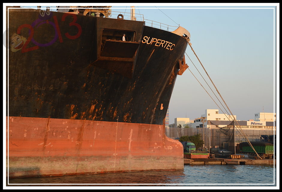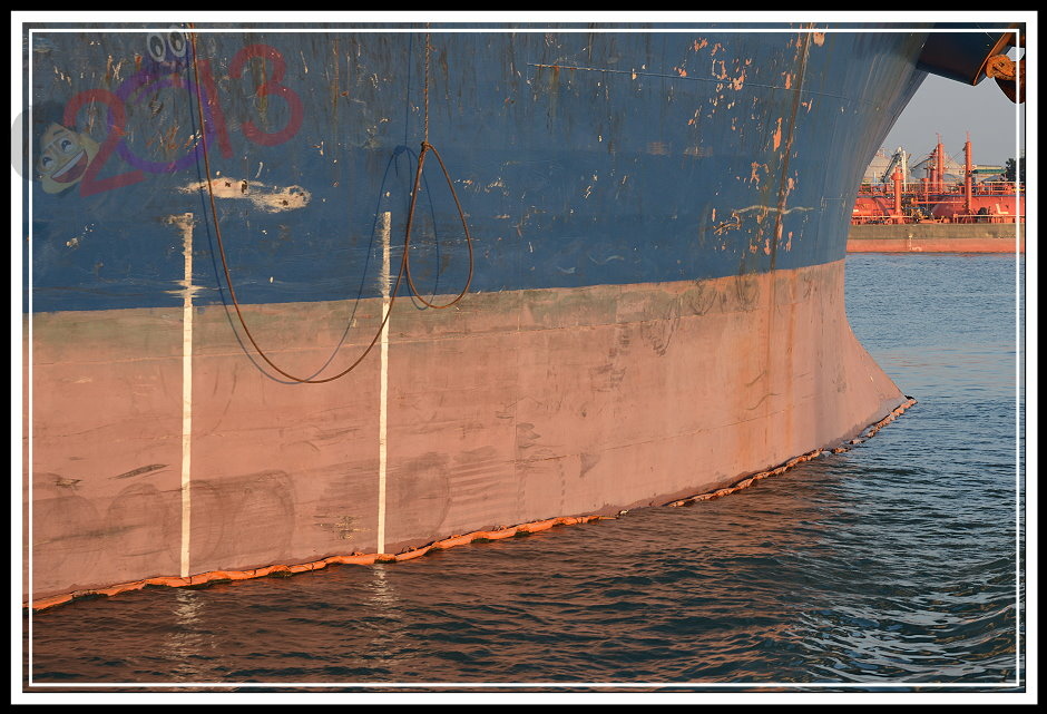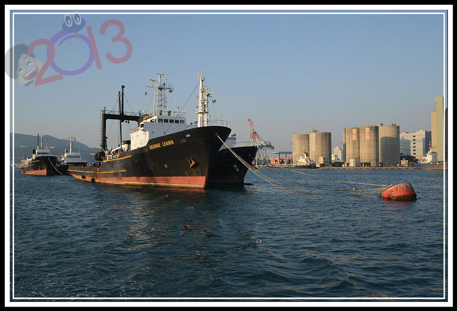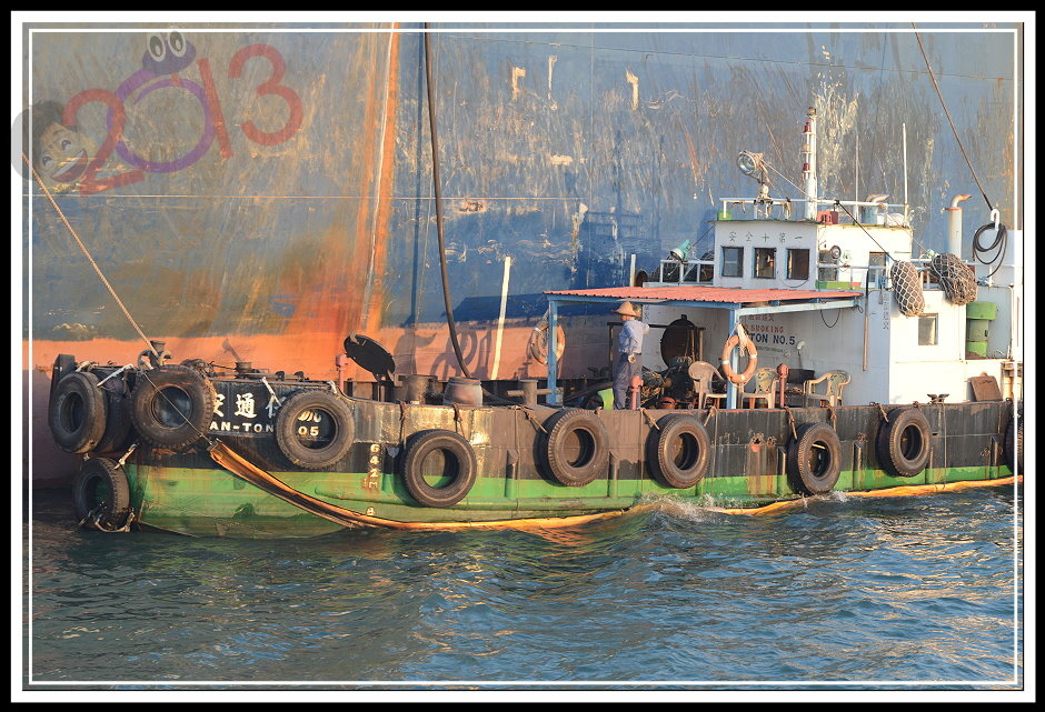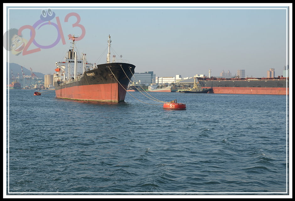 有些船靠泊在迴船池中間的繫纜上,並不似我們熟知地在岸邊裝卸貨。遊艇上的船東說明,除了港務局四艘救難船是停放在繫纜邊之外,停在這裡的船隻多半是有問題的,可能是船務公司有了財務糾紛,船隻被扣押,等待解決的過程中,船就繫在這不靠泊碼頭的位置,船東可以少付一點費用。