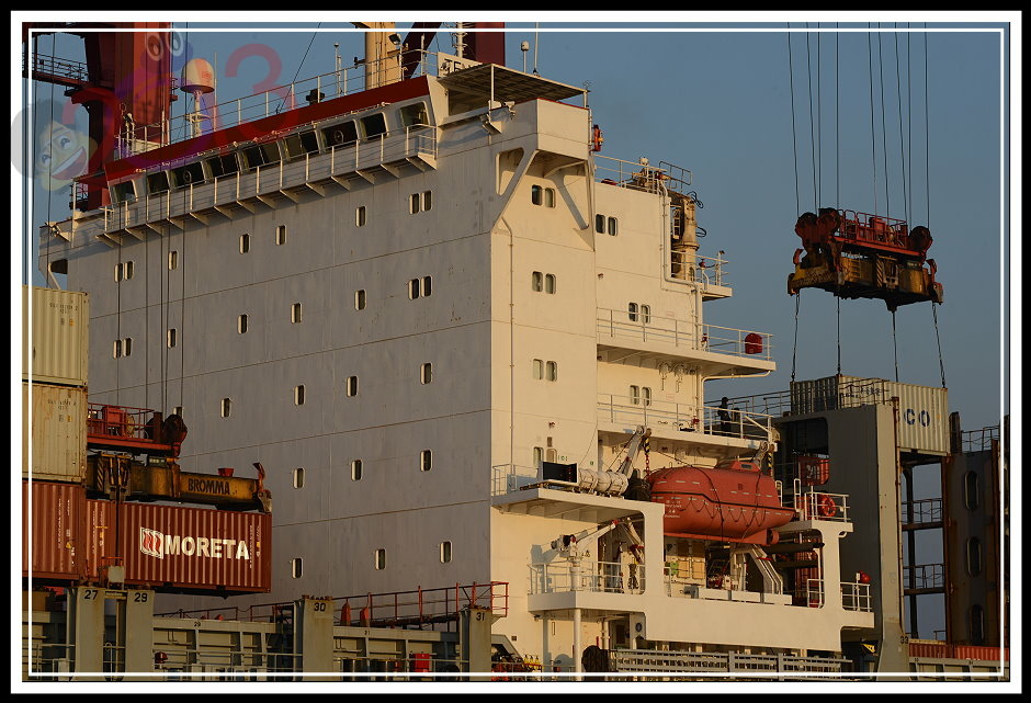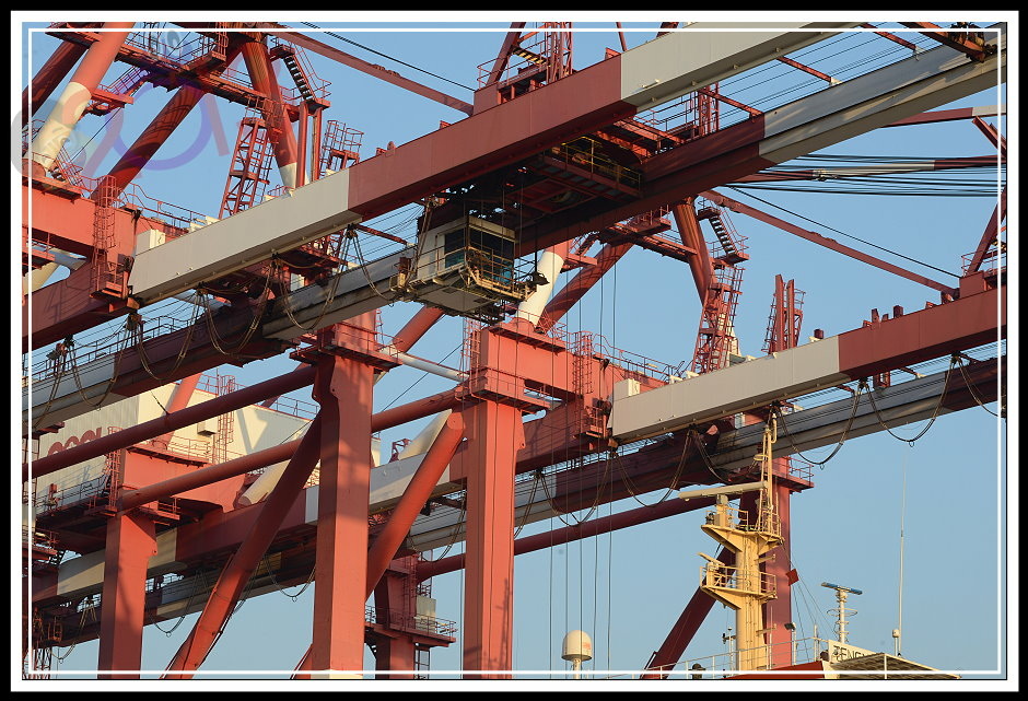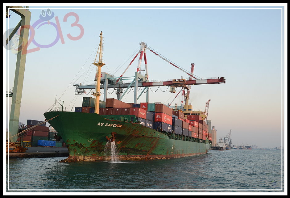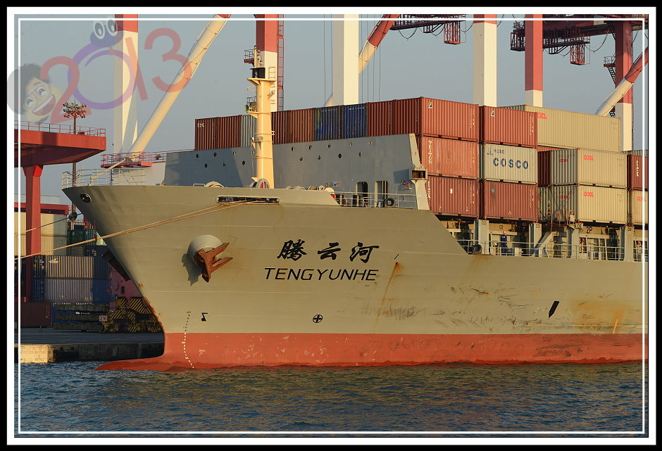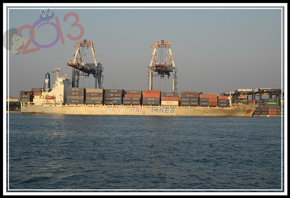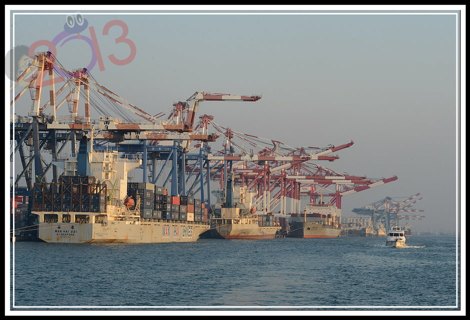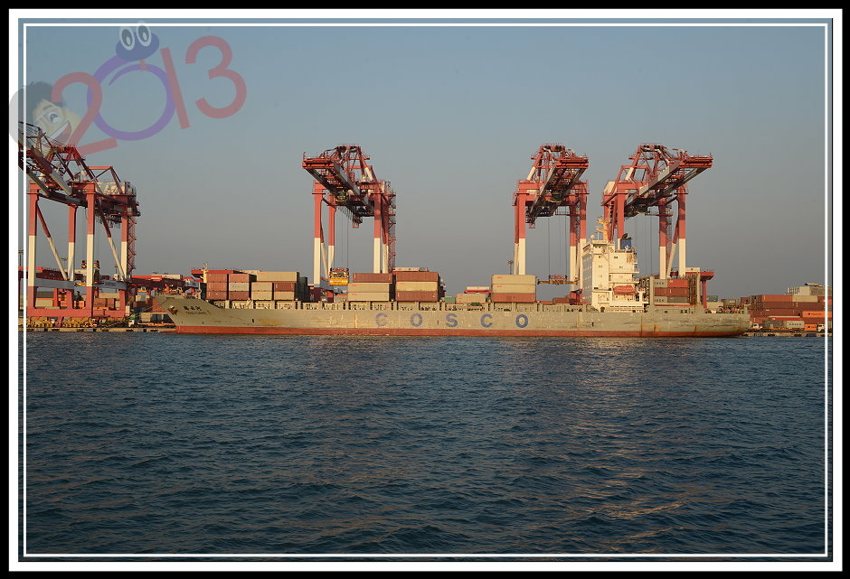 萬海、COSCO、陽明、長榮在這裡都有各自的貨櫃碼頭,要不是船東的解說,還真不知道台灣的海運業其實在世界上佔有舉足輕重的地位...可以與香港航業鉅子李嘉誠平起平坐,這些高聳的起重機正是這些海運公司營運能力的象徵。我們一派輕鬆地遊覽,這些起重機確證分秒必爭地吊掛貨櫃,據說這些起重機操作員除了有迅速吊掛貨櫃的專業能力,還必須辛苦地在半空中完成吃喝拉撒,上工後不到工作完成不輕易下來。早期,是人人欽羨月入數十萬的高薪行業,但隨著進出口規模的縮減...行情也跟著滑落...船東邊說不免也邊流露對台灣產業備受世界各新興市場競爭壓力的憂心。