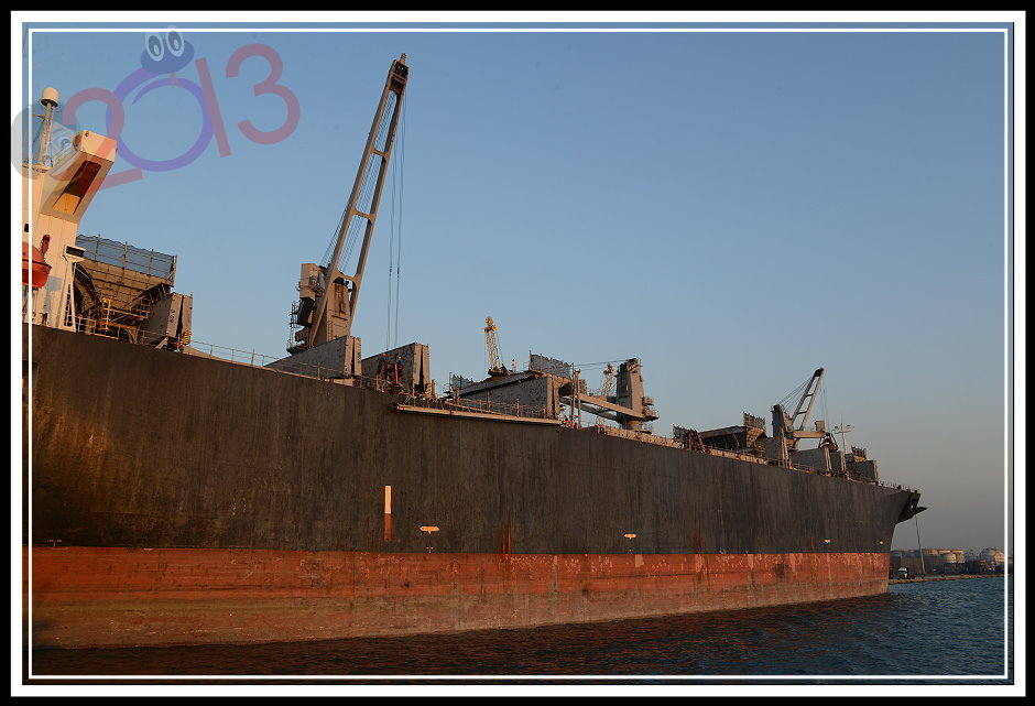 船行到盡頭轉了180度,沿著貨櫃碼頭高聳的起重機群腳下回頭。貨輪輪每艘都巨大無比,光是船樓就有七、八層樓高,船身如果再加上水中為露頭的部分,大概都可以是摩天大樓了。