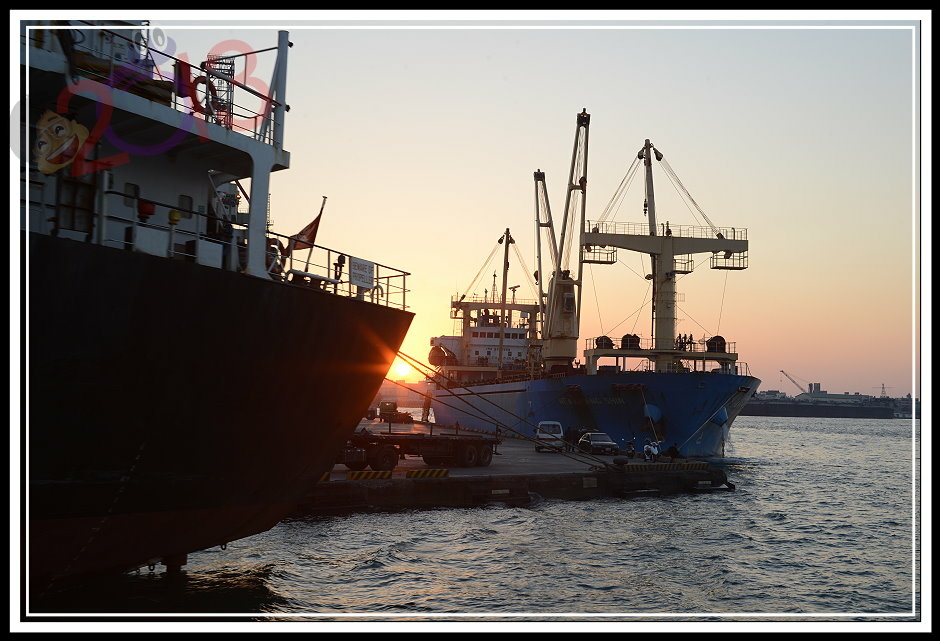好不容易船慢慢開離岸邊,這才發現...其實今天的夕陽很美,剛剛在岸邊拍船,苦惱著逆著太大的陽光效果不好,這下子全成了美麗的順光...老船、新船全都艷麗起來了。