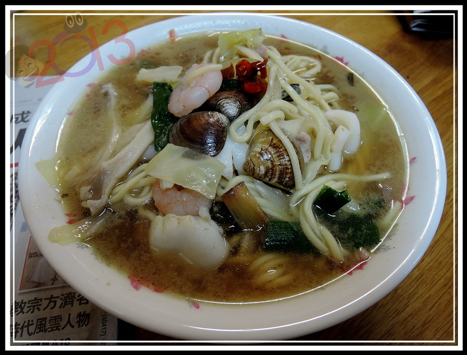 當...嘴饞的時候、在外面周遊「列食」到不知如何是好的時候,我就會將車子停到潭記對街只有熟客才知道...可以並排停車卻又不會被趕、不妨害交通的位置。漫步過街,在經過老闆的爐灶時微微頷首說:「一碗什錦麵。」幾分鐘後,店員就端著尖滿出碗的什錦麵上桌...看著...暗暗許下承諾「好吧!傍晚就多跑兩圈好了!」然後愉快地拿起筷子品嘗潭記的什錦麵、端起大碗儘情地喝著麵湯...趁老闆還沒有空過來與我談太極拳。