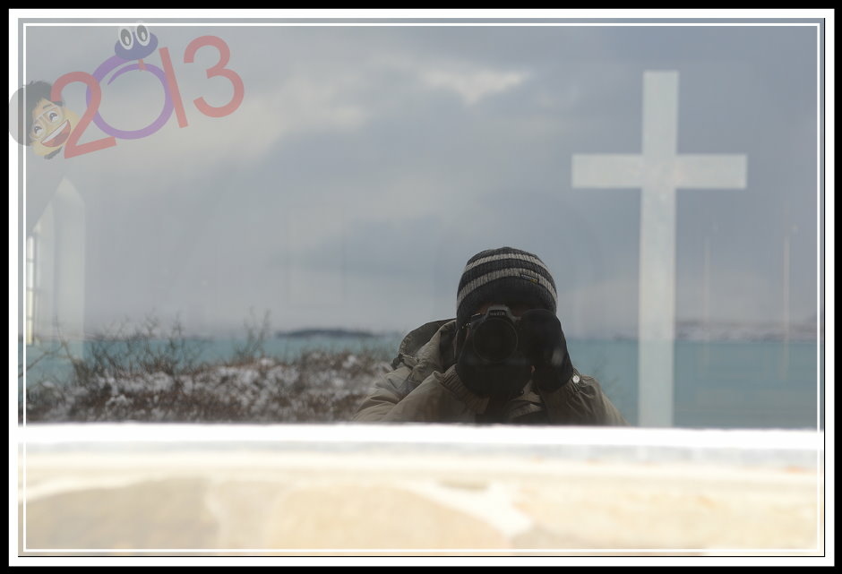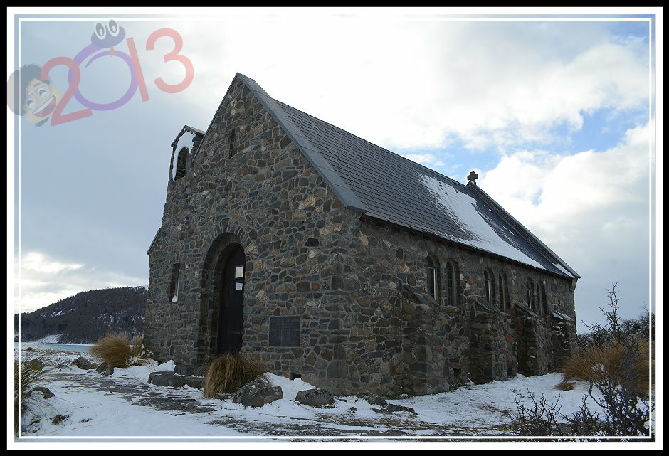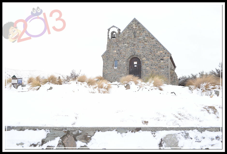 Lake Tekapo 湖畔有座石砌的牧羊人教堂是著名的景點,看過很多由教堂窗戶拍攝湖面的照片,可惜這天大門深鎖,也只好利用窗戶玻璃的倒影玩弄著「到此一遊」的遊戲。