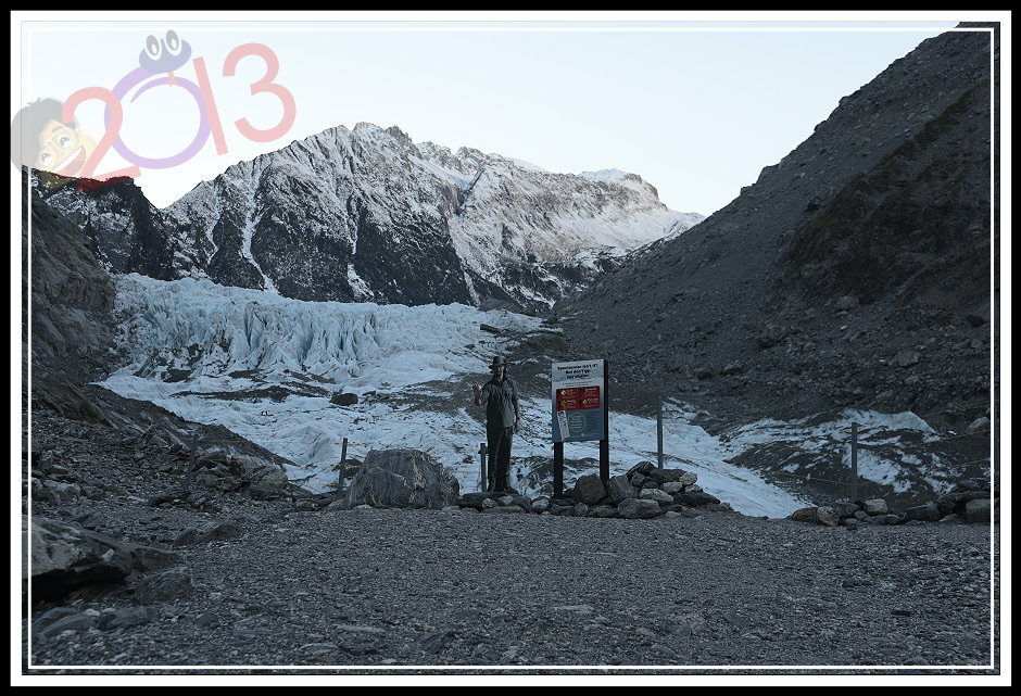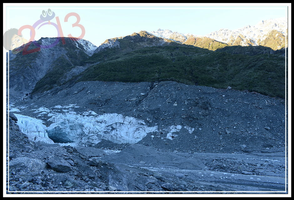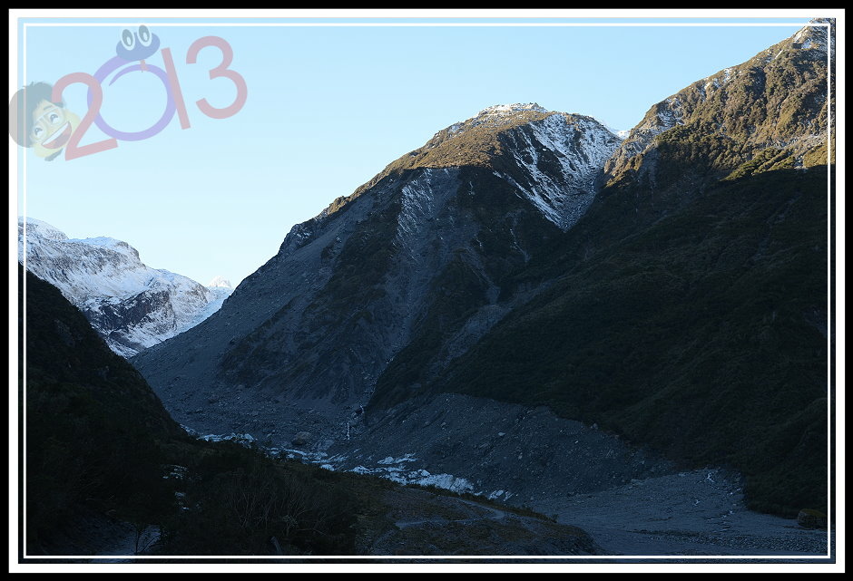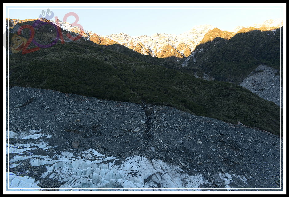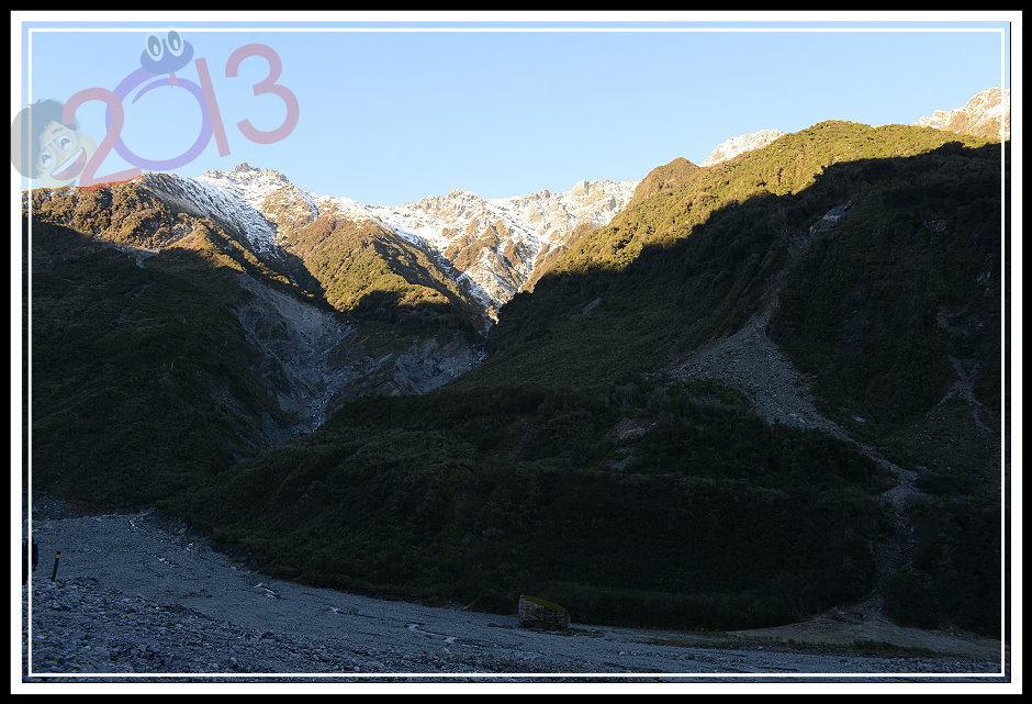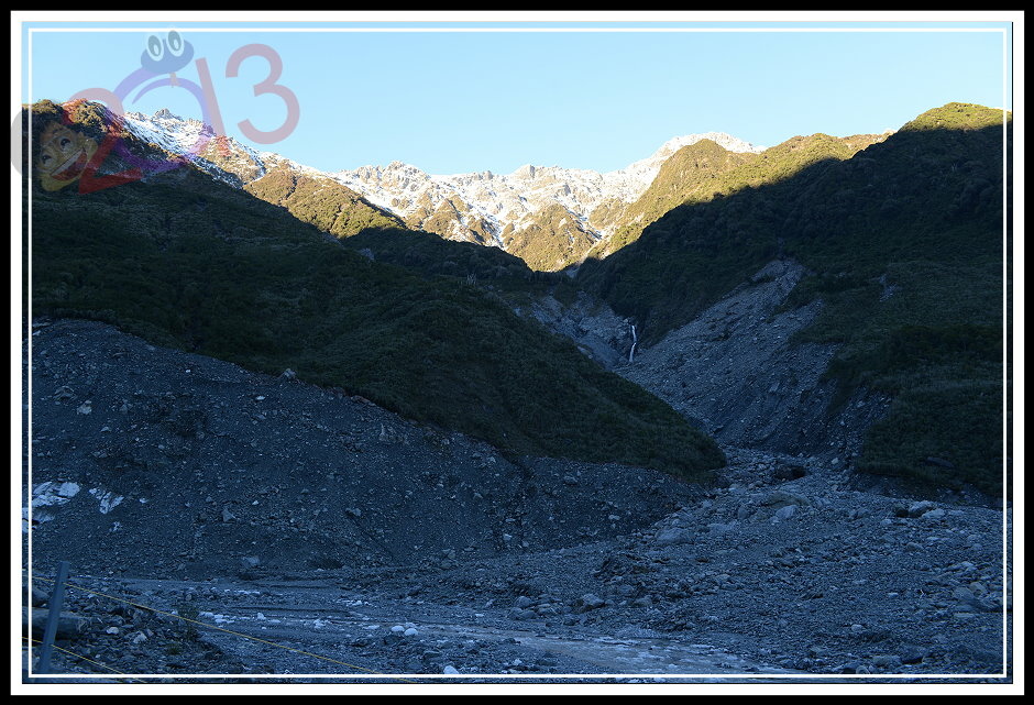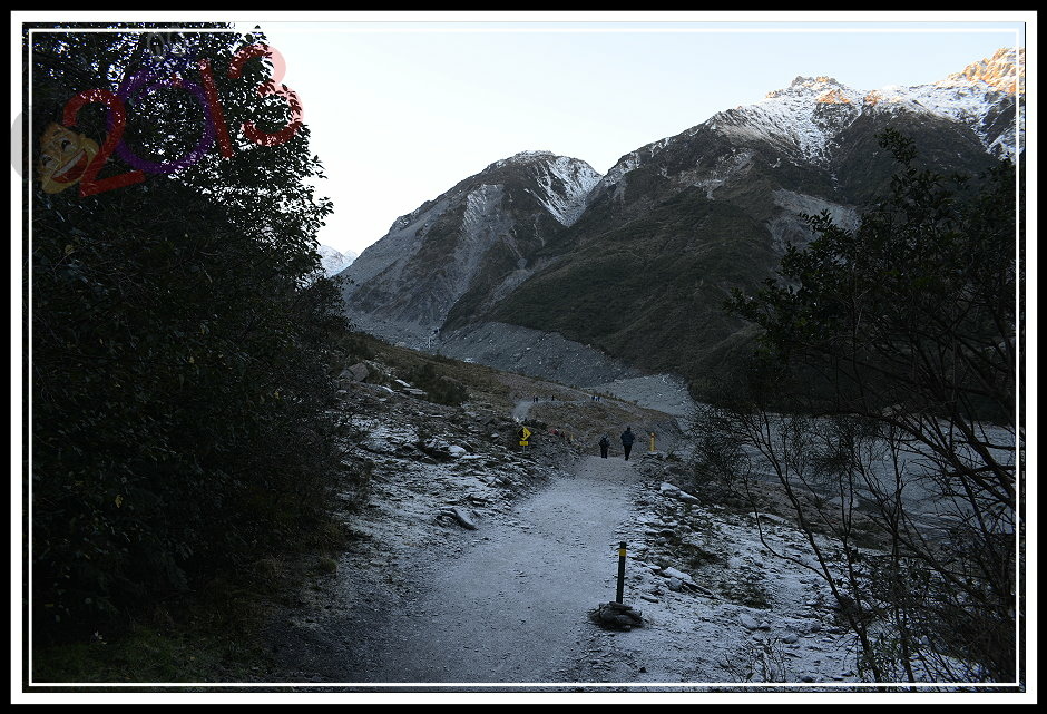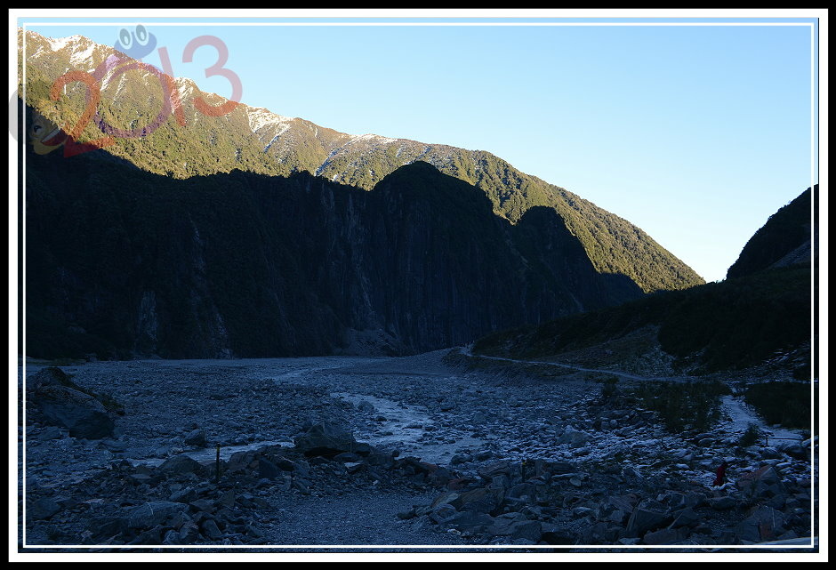 花了半小時,從入口走到最接近冰河的管制處,這還包括陽光照上對面積雪山頂的美景吸引我不斷停下來取景的時間。沿途雖然設施簡單,但可以發現紐西蘭人將碎石坡上的小路很用心地夯實,不需要柏油、水泥,也建構出平整且不需要「踢石子」的登山小徑。這一點「用心」,可真值得我們借鏡,以最小的干擾還親近大自然...當然也是「花小錢賺我們的大錢」。