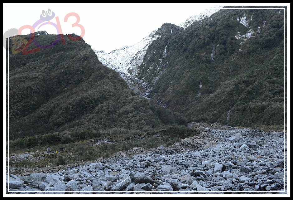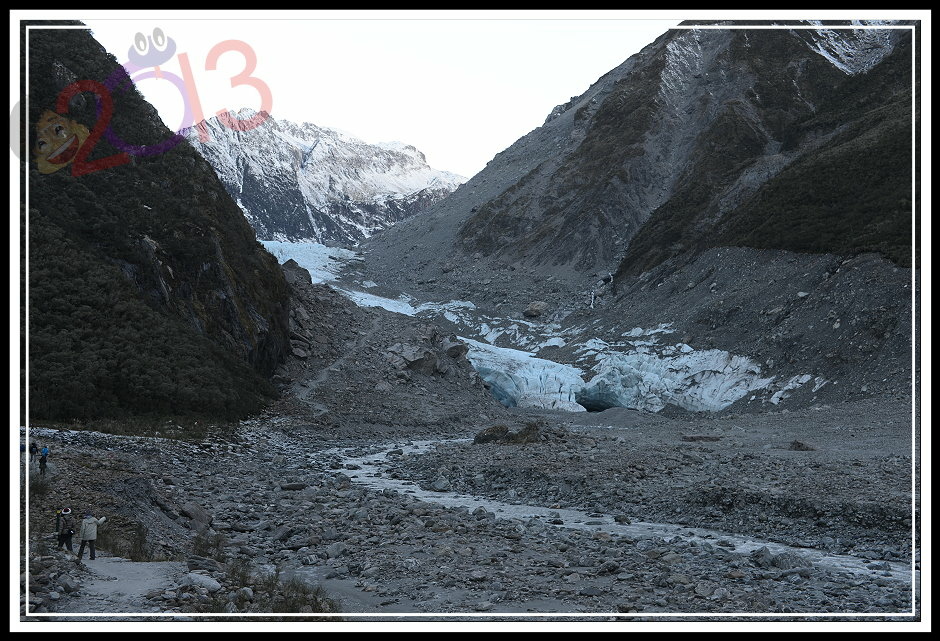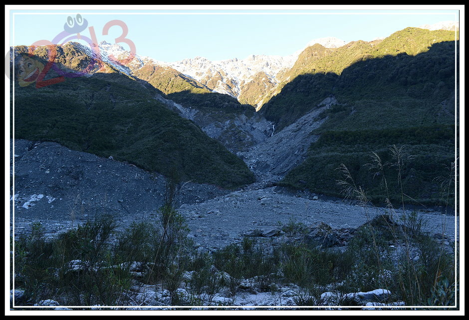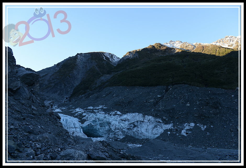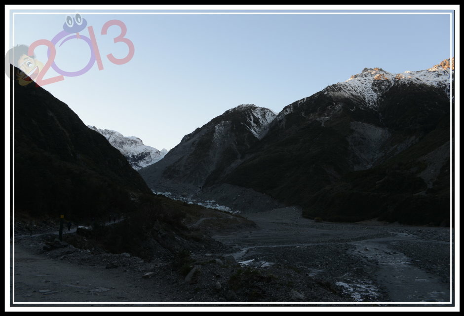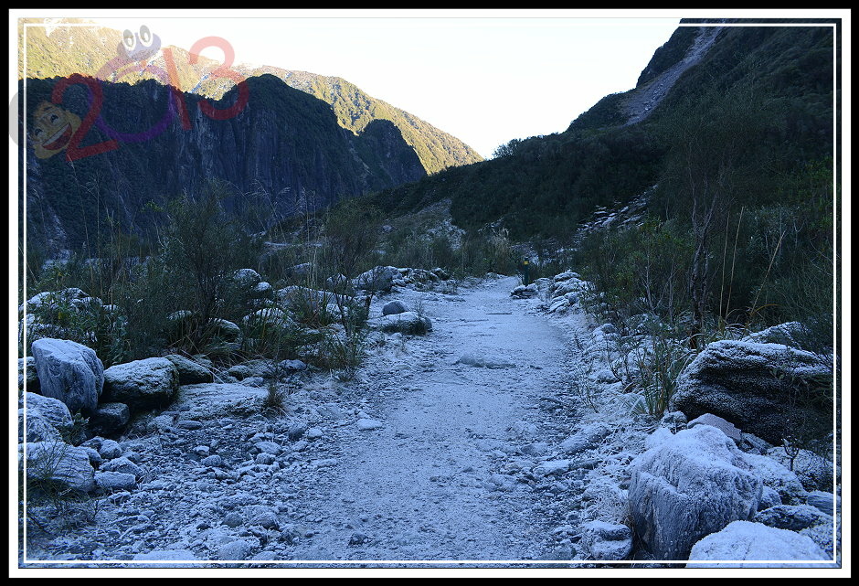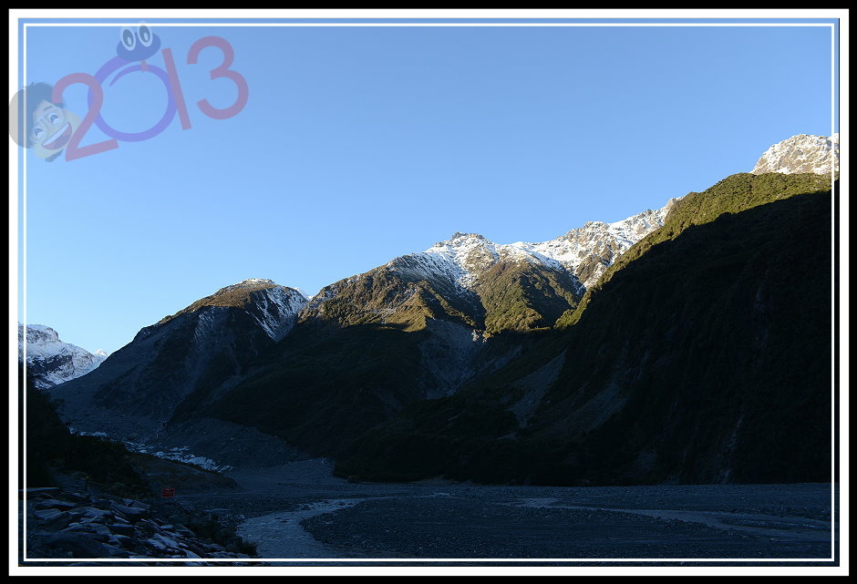 花了半小時,從入口走到最接近冰河的管制處,這還包括陽光照上對面積雪山頂的美景吸引我不斷停下來取景的時間。沿途雖然設施簡單,但可以發現紐西蘭人將碎石坡上的小路很用心地夯實,不需要柏油、水泥,也建構出平整且不需要「踢石子」的登山小徑。這一點「用心」,可真值得我們借鏡,以最小的干擾還親近大自然...當然也是「花小錢賺我們的大錢」。