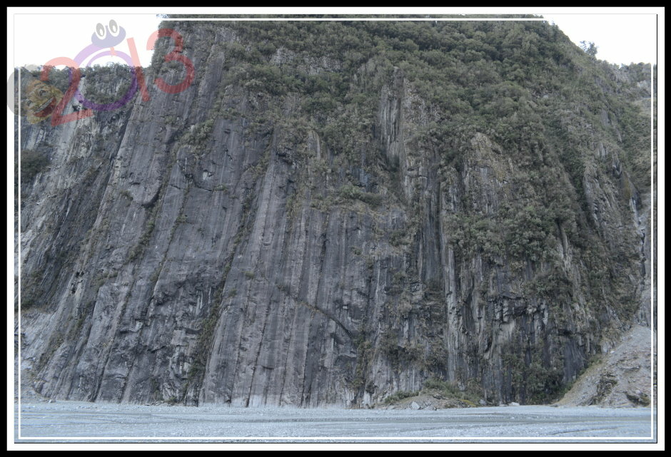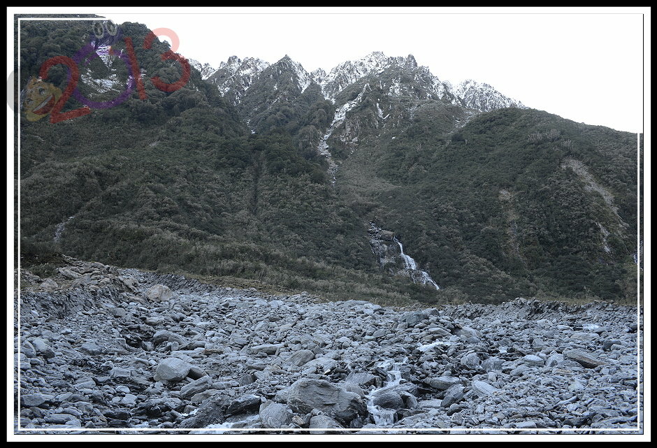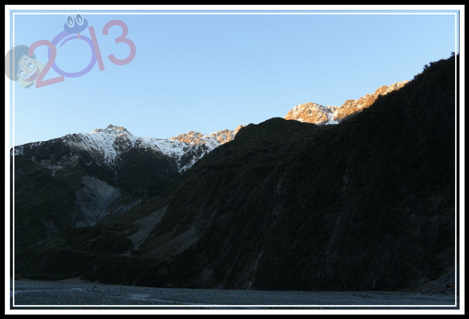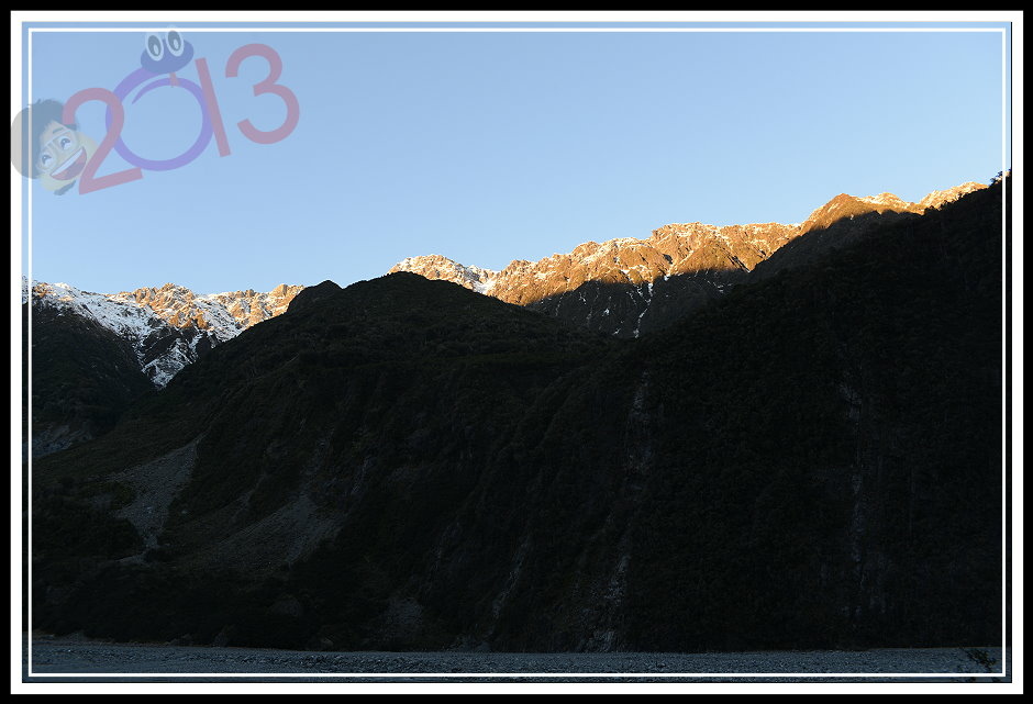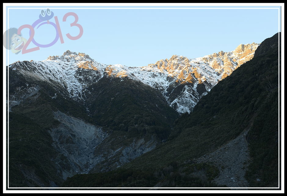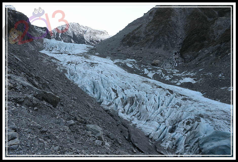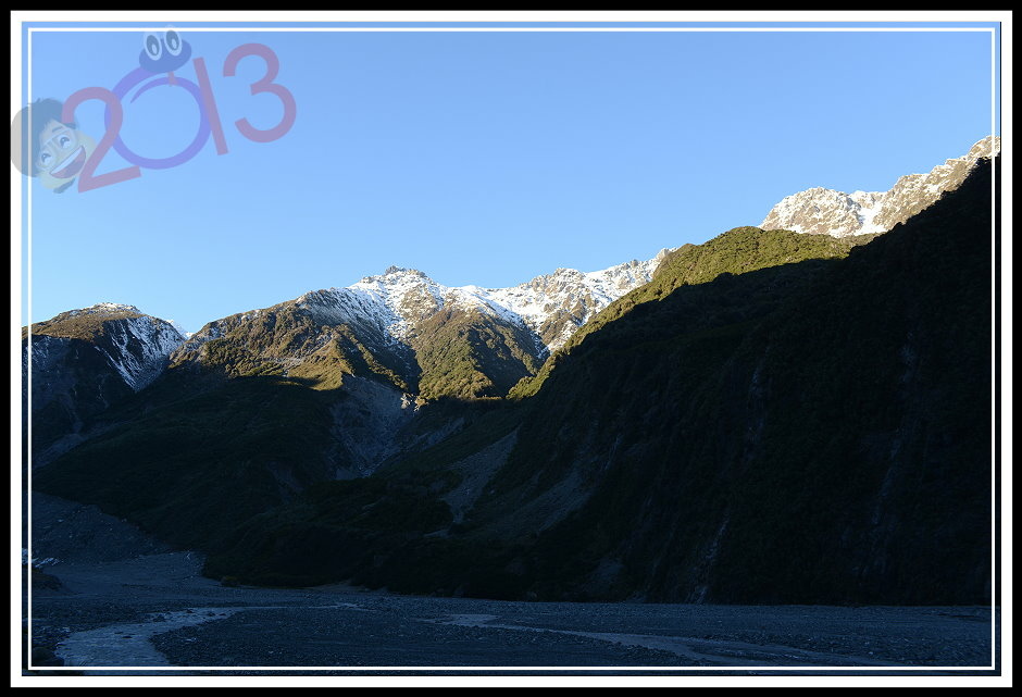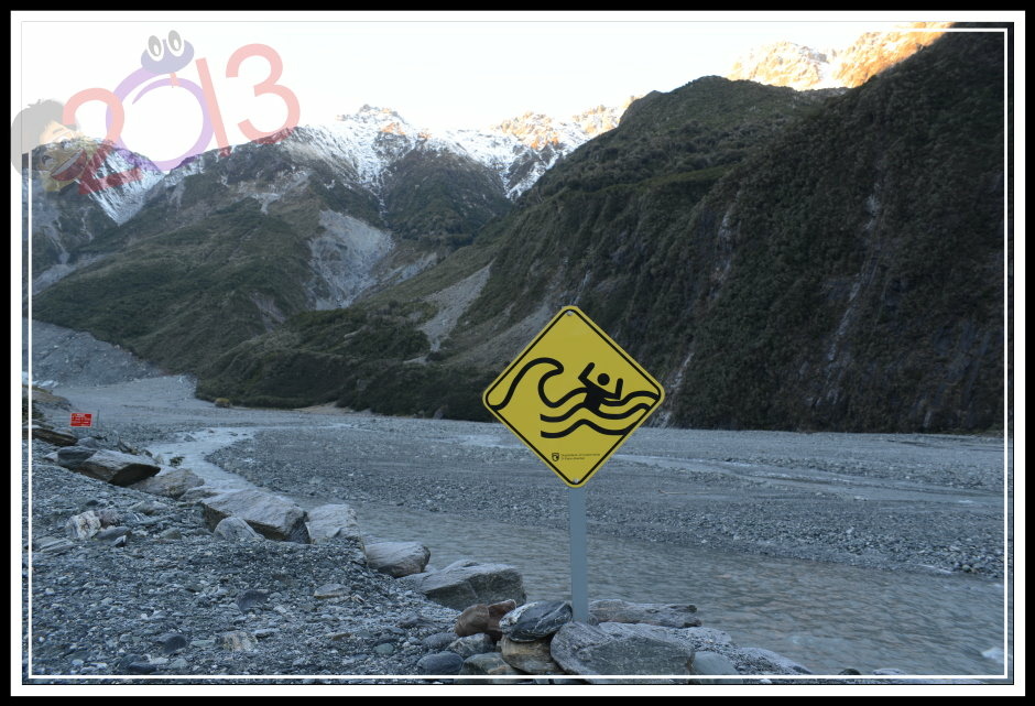 花了半小時,從入口走到最接近冰河的管制處,這還包括陽光照上對面積雪山頂的美景吸引我不斷停下來取景的時間。沿途雖然設施簡單,但可以發現紐西蘭人將碎石坡上的小路很用心地夯實,不需要柏油、水泥,也建構出平整且不需要「踢石子」的登山小徑。這一點「用心」,可真值得我們借鏡,以最小的干擾還親近大自然...當然也是「花小錢賺我們的大錢」。