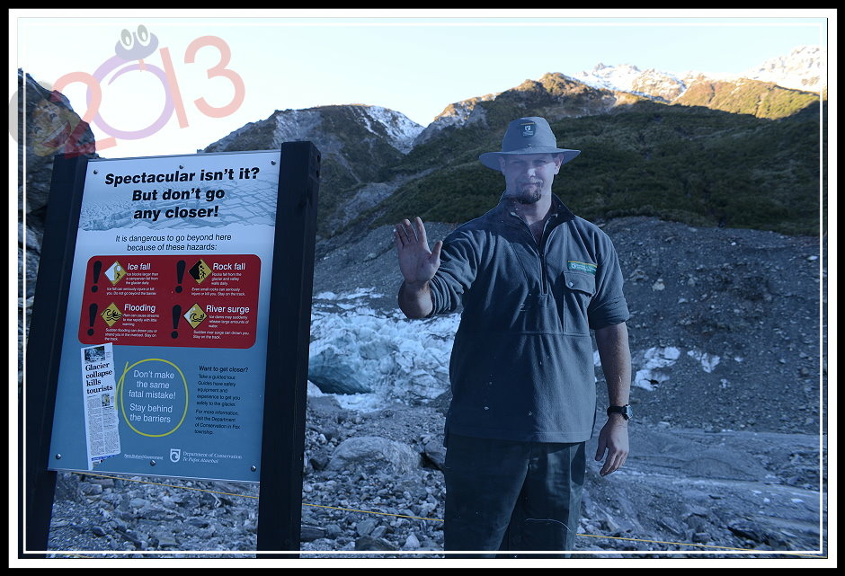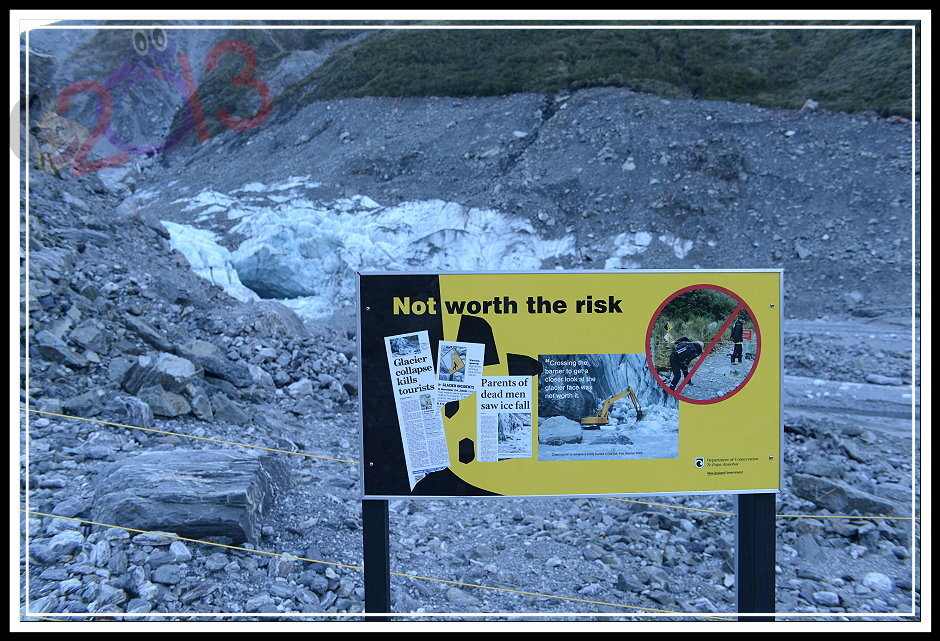 冰河入口被簡單的繩索、告示牌管制住,告示牌每天由國家公園管理局的人員依照冰河的狀態填寫管制範圍。我們屬一般觀光客,無緣踏上冰河;管理局另有冰河上的健行行程,據旅行社的官方說法,台灣目前的旅行社尚沒有任何有冰河健行的活動行程,原因是其危險性...不過,我想真正的原因大概是「時間不足」與「官方獨家經營」吧!