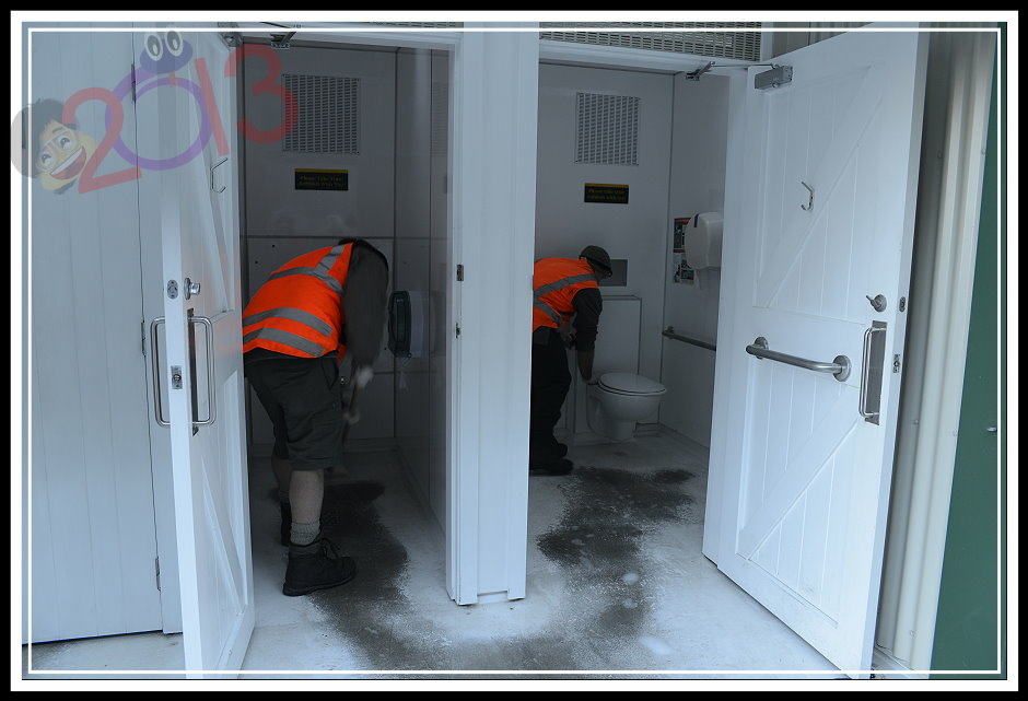 福斯冰河的觀光設施簡單,將河床碎石壓實後加上繩索、告示牌就完成整個遊憩環境的營造,我想最豪華的應該是那間小公廁吧!三間獨立廁所組成..當天下山卻遇見兩位粗壯的帥哥努力刷洗,我想...廁所乾淨、無異味,除了天氣涼冷外,這也是主要原因吧?!!