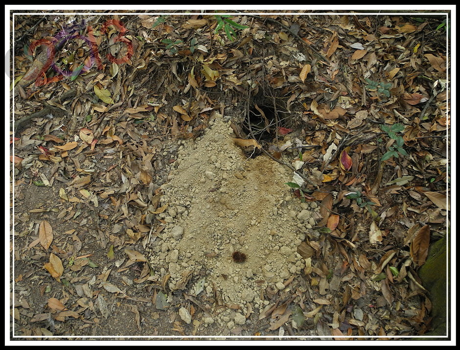 頑皮的穿山甲在山徑中間挖了巢穴,不避諱地將新土堆棄洞口,還在土堆上踩了一堆新鮮腳印。據說一個穿山甲洞有數個出口,也許因此才不需要小心翼翼地遮掩。