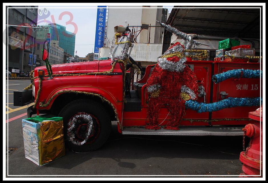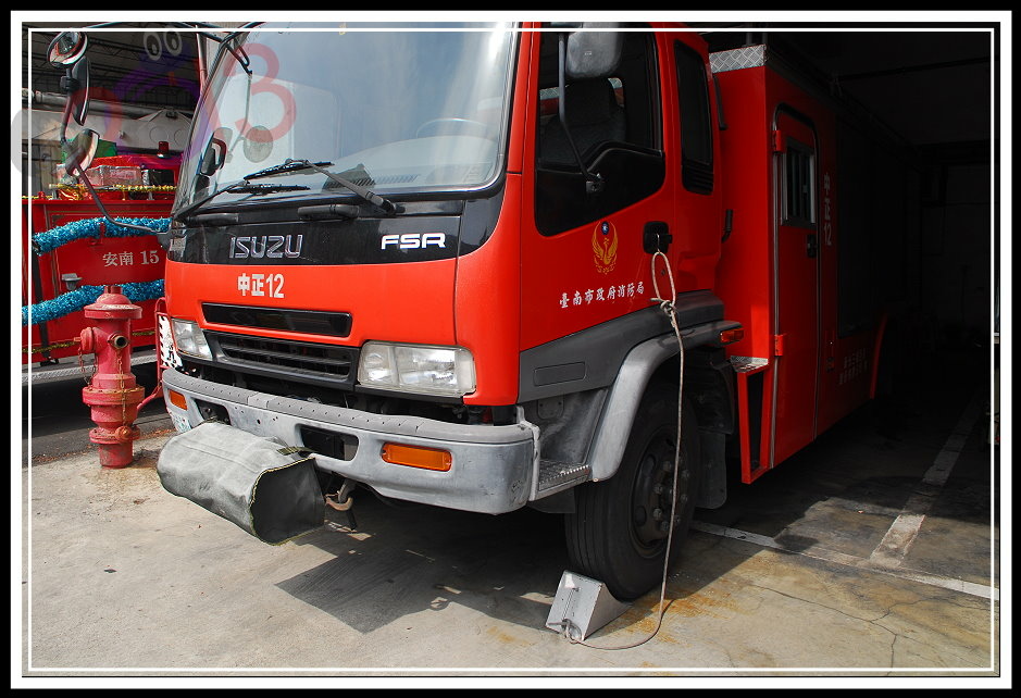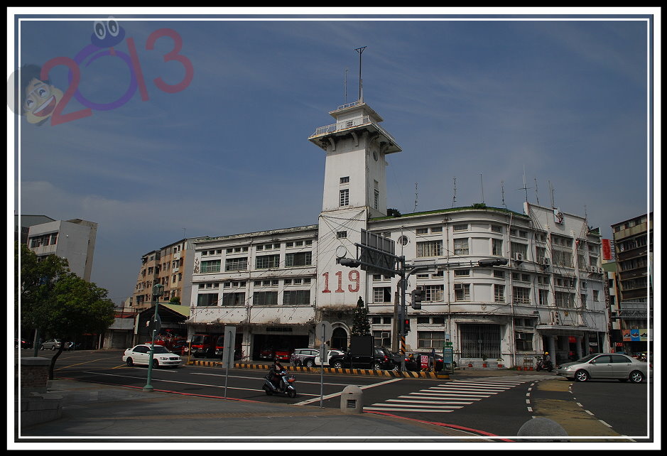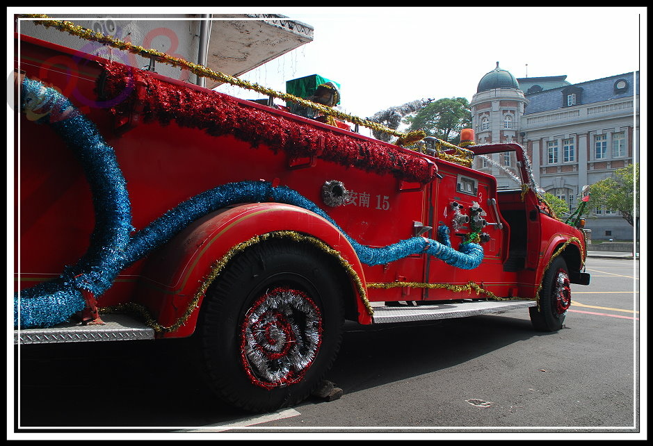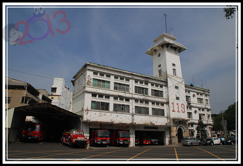 我們走過馬路近距離參觀,發覺大概因為使用中的建築物又被列為古蹟,許多使用損壞的修繕不能恣意而為,與對街台灣文學館得完美行想頗有落差。那天,古蹟消防隊前邊還擺了一部 TOYOTA 的敞篷古董消防車,車上披滿彩帶作為防火宣傳。