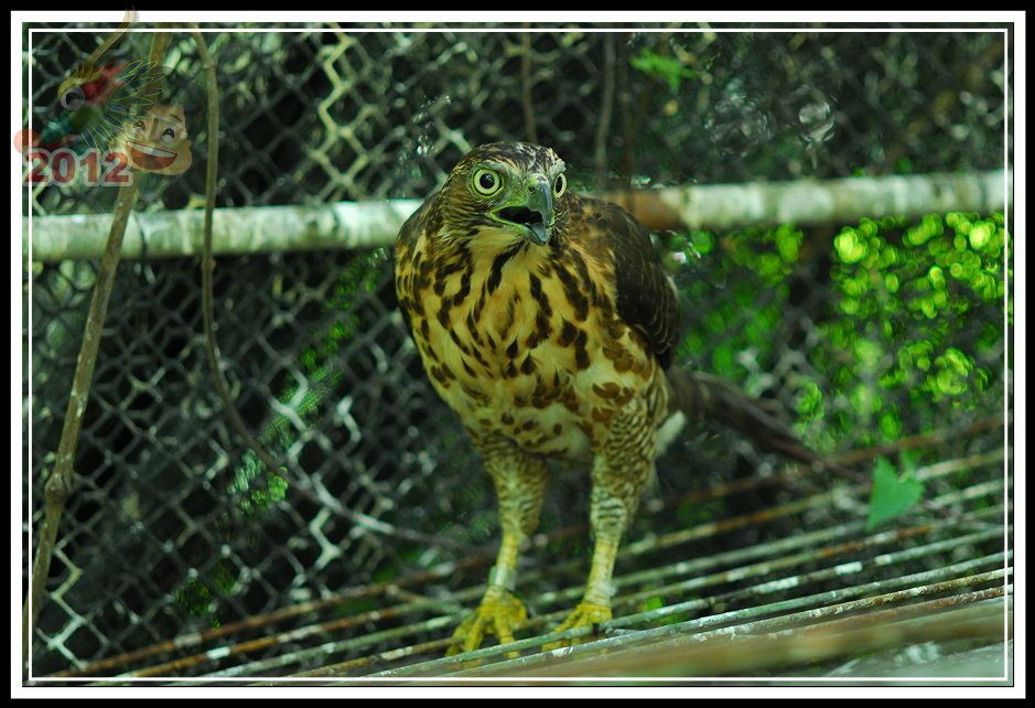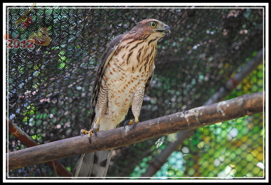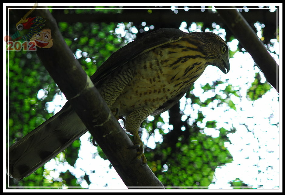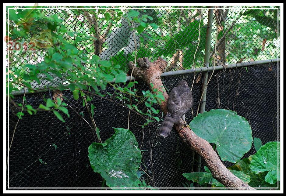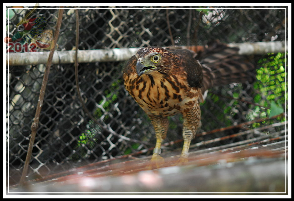 網室狹長,裡面有四隻或是傷癒或是長成亟待野放的鳳頭蒼鷹。一開門就引起騷動,本來孤傲高飛的鳳頭蒼鷹此時驚慌地就在頭上來回飛行。稍事,習慣人群與快門聲,牠們漸漸盯緊鏡頭觀察。