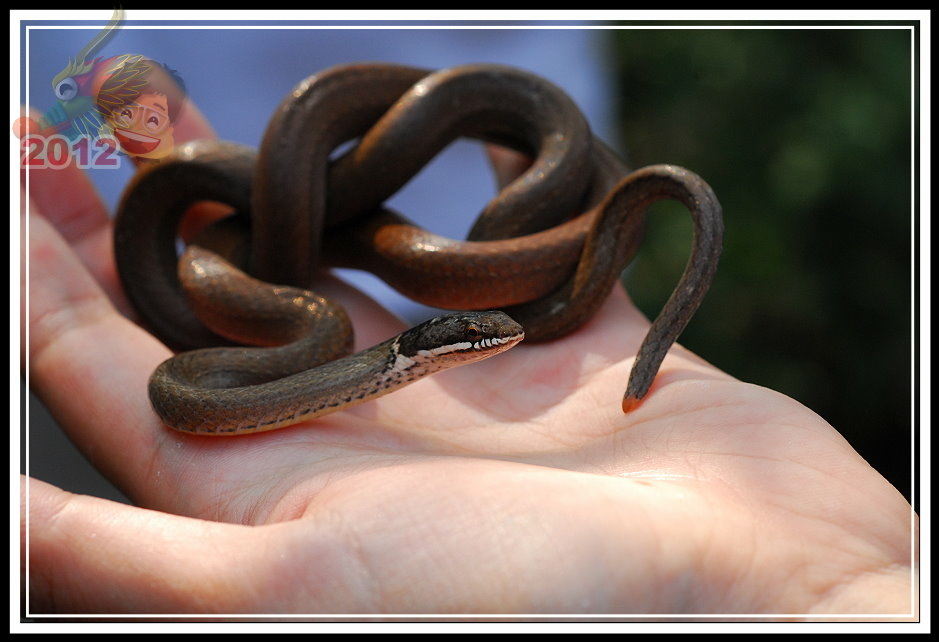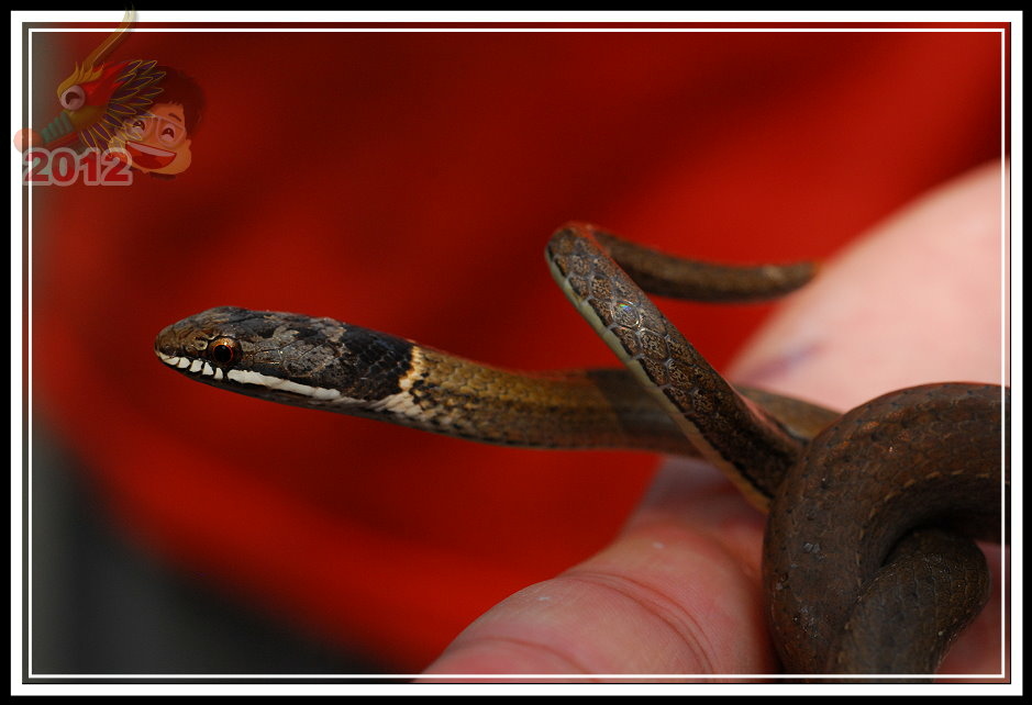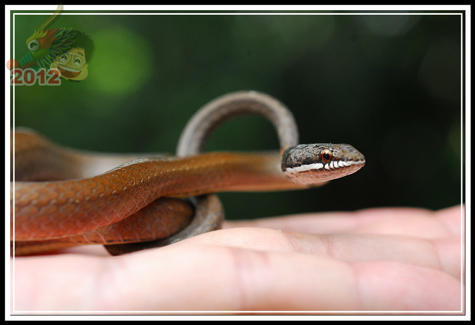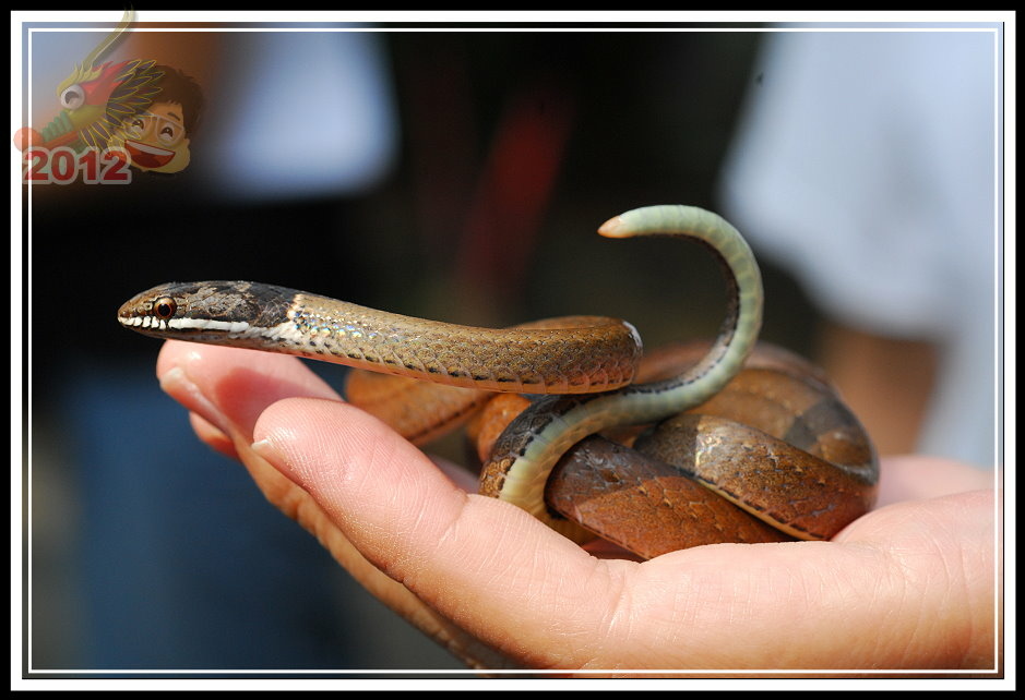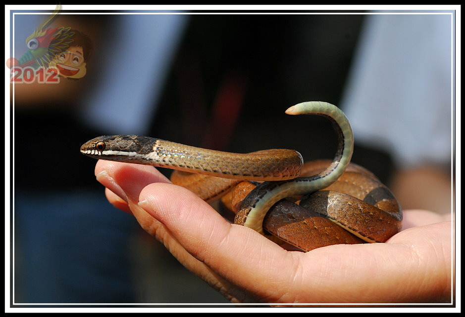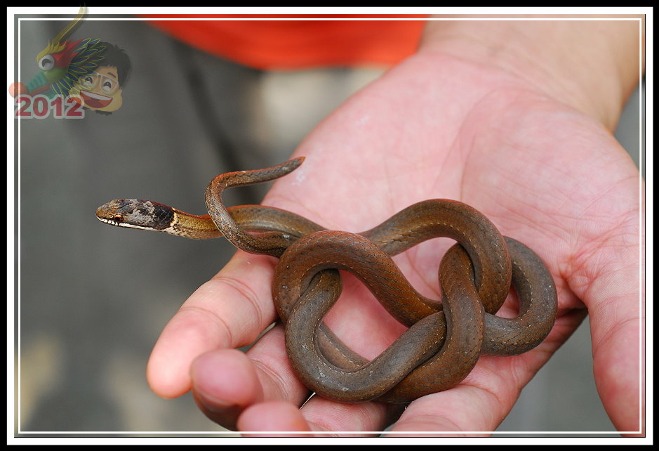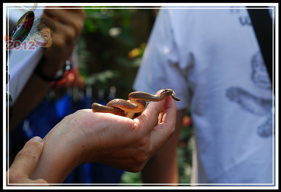 黑頭蛇,成體最常不過72公分,黃褐色的身軀,前端頭部灰黑色,上唇一直到頸部有一條白紋。性情溫馴,於日間活動,以蚯蚓、蟲為食。遇見危險的時候往往定住不動,彷彿是根樹枝。講師一介紹完,順手就往旁邊將黑頭蛇「傳遞」過來,真的牠就以奇特的姿勢定住,只有當鏡頭或手揮舞的幅度大一點才會跟著抖動...要不是養動物很麻煩,這倒是一隻優秀的寵物蛇。