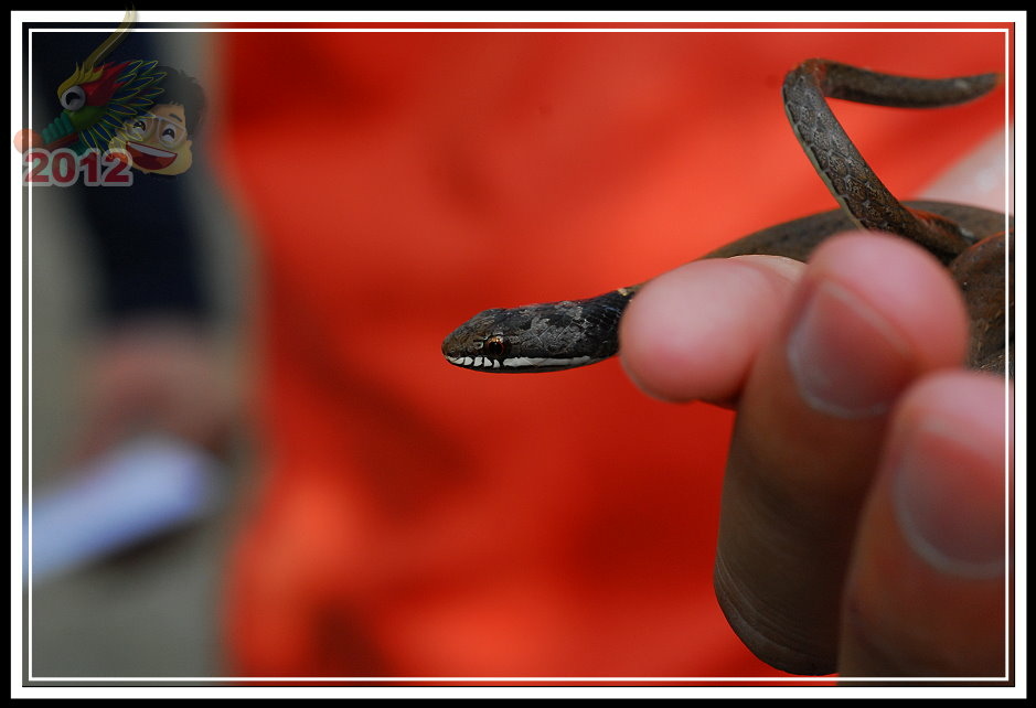 有些物種被認為少見,其實是因為他們的活動範圍、時間與人類重複得少,因此曝光的機會也少,很容易被當成「少」。講師邊說邊從蝦籠裡倒出一條黑頭蛇,邊說:並不是每一條蛇見到人都劍拔弩張,即使最毒的雨傘節,見到人也會將身體縮成一圈,然後把頭藏在身體裡面,除非被逼得走投無路,牠們多半選擇「明哲保身」。黑頭蛇就是極端溫馴的蛇類之一。