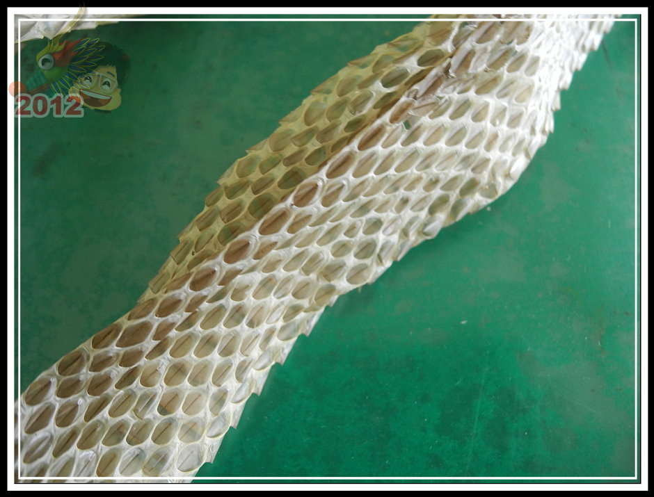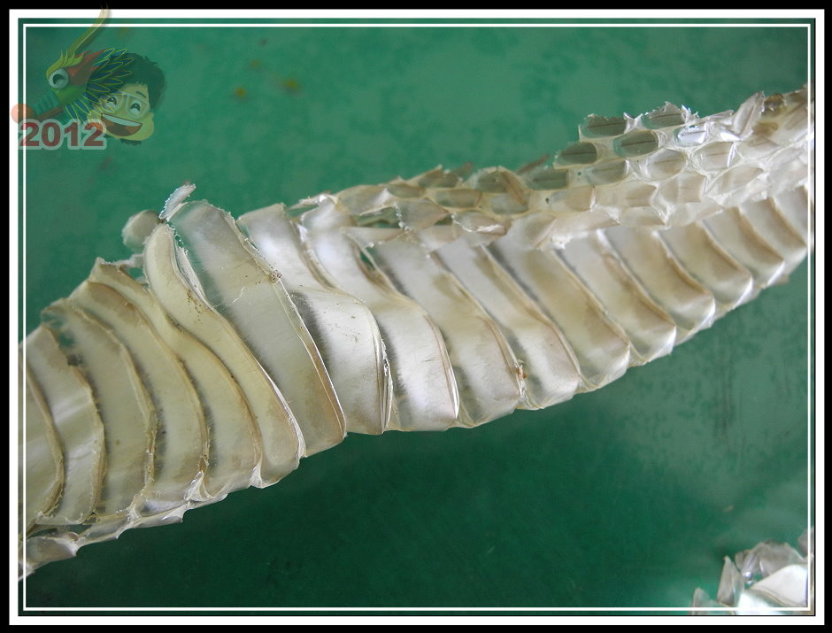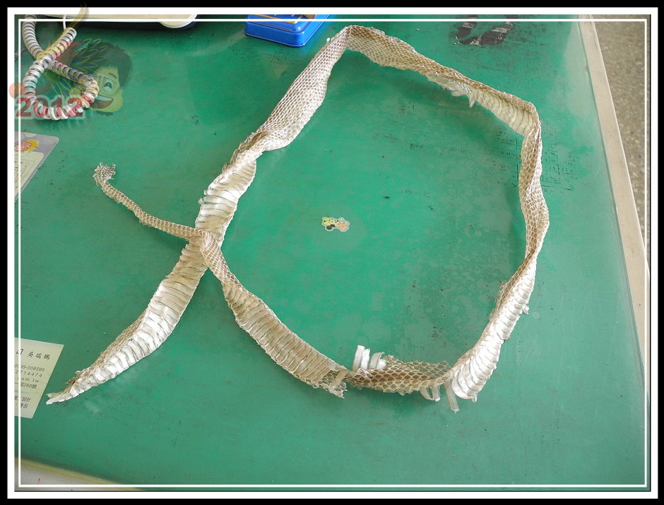 現在看來這張蛇皮與前幾天逮到的臭青母不無相干...至少我希望,萬一還有一條這麼大的溜,我可要...皮繃緊一點了。咬傷人不太可能...嚇到人就麻煩大了!維護校園安全捨我其誰,但大白天去哪裡找?除非牠自己不長眼。