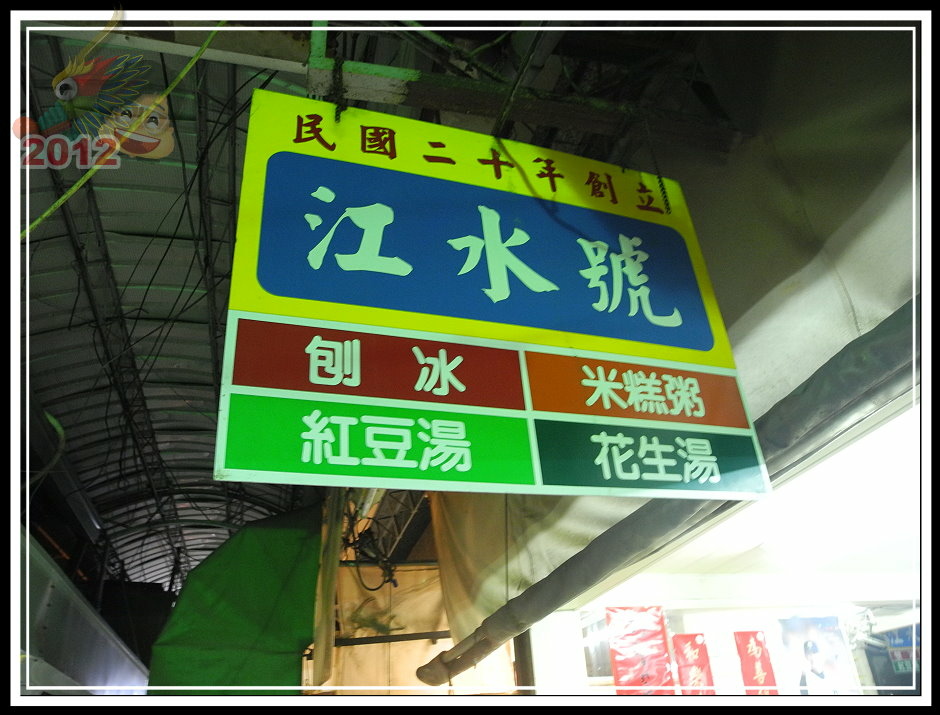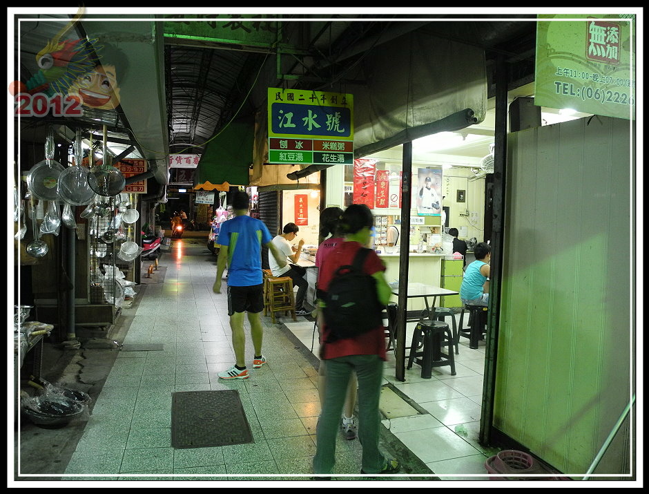 江水號賣剉冰,炎炎夏日的南部氣候再加上傍晚才踢玩高溫的府城老街,來一碗最消暑假,雖然如此行為被中醫評為『不可取』。店外也懸著店號,並且驕傲地標上『民國20年創立』,在府城行走,似乎店家都不約而同地以此標榜,而且五十年的店齡只算基本門檻。