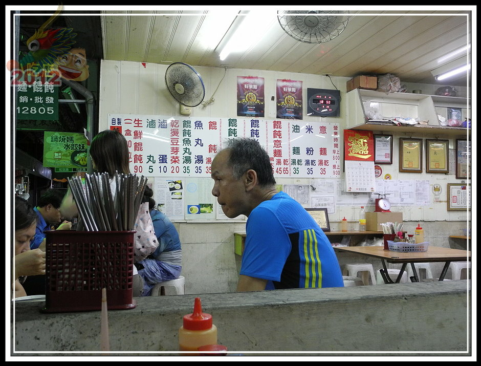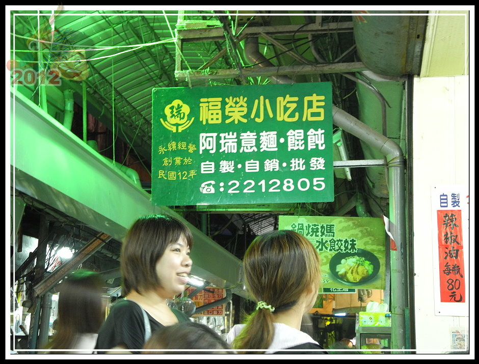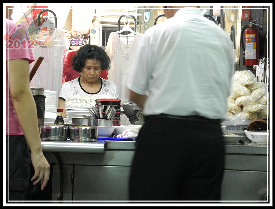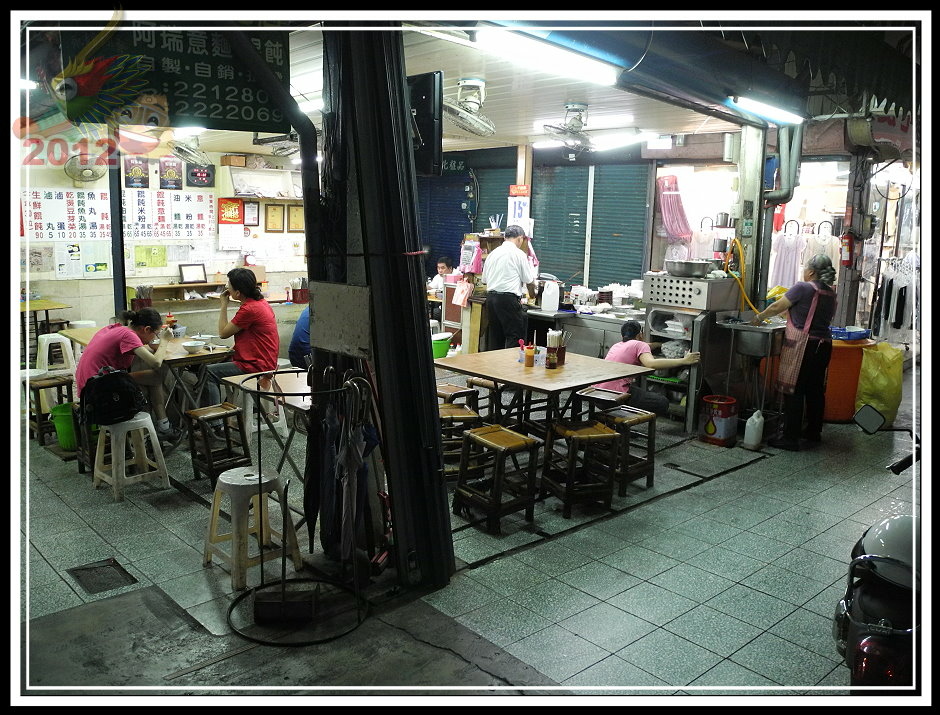 我錯估了距離,從赤崁樓過來還要一段距離,平時雖然喜歡爬爬小山,但在都市裡行走、逛街,這要算最遠的紀錄了。當我汗流浹背地找到南華街,興沖沖地尋找16巷,還擔心人太多沒地方做。一轉,我愣住了...南華街16巷...路牌貼在幽暗的菜市場門口...看來這是早市,傍晚時分店家多半打烊休息了。怎麼會?硬著頭皮往裏頭走,柳暗花明又兩店...江水號與阿瑞意麵就比鄰而居,除了對面的刀具店、旁邊看不出賣什麼的小店...就屬這兩家最有人氣,而且燈火通明。尤其阿瑞意麵...鍋爐正蒸騰地冒煙,老闆娘一家忙碌地煮麵。