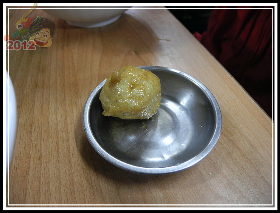 一會兒,滷丸出現了...一小鐵盤盛著一顆滷貢丸...又是沒見過的上菜方式...。是我孤陋寡聞?真的...我在其他地方沒見過這賣法...但入口貢丸香脆、入味的醬油香。