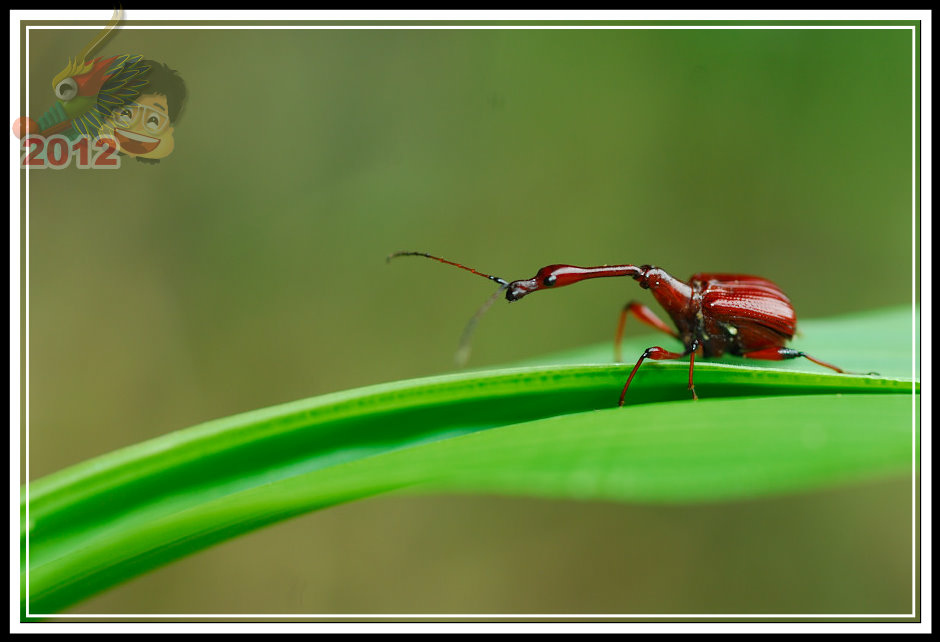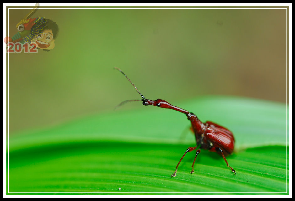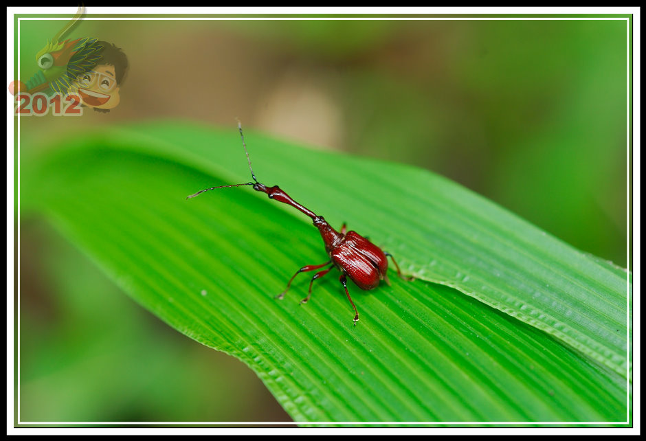 棕長頸捲葉象鼻蟲是昆蟲世界的長頸族,這隻在步道邊葉子上休息的雄蟲,有較長的頸部;雌蟲則頸部較短。顧名思義,捲葉象鼻蟲以捲葉築巢來繁殖。我分別在不同的角度拍下牠,正想再換位置,一個大動作碰到葉緣,他忽然「六腿一縮」,假死地掉進草叢裡。