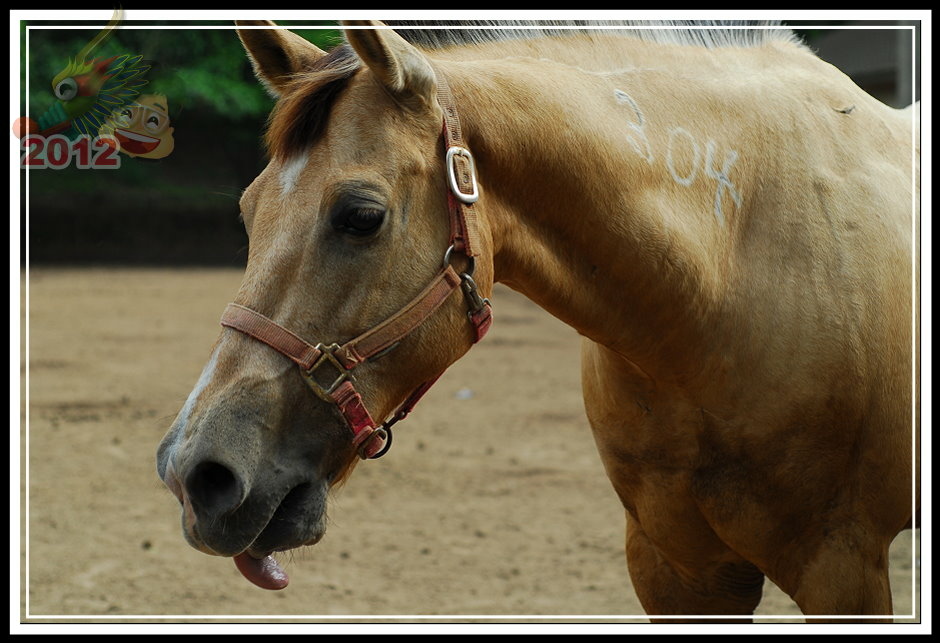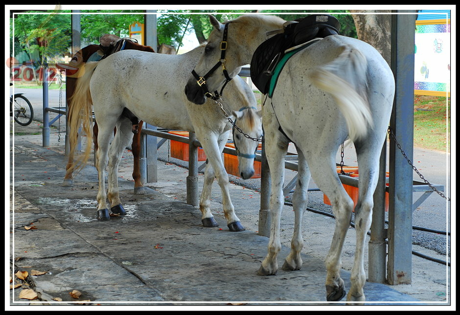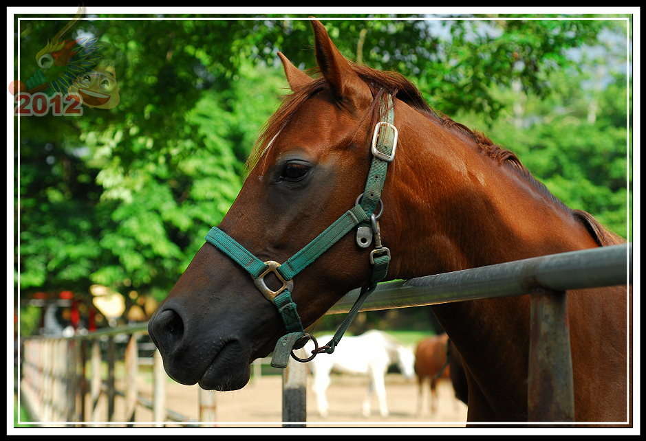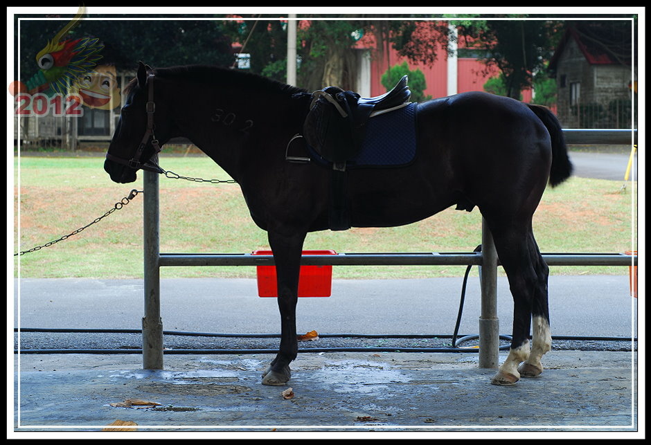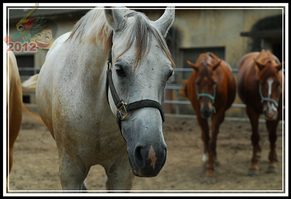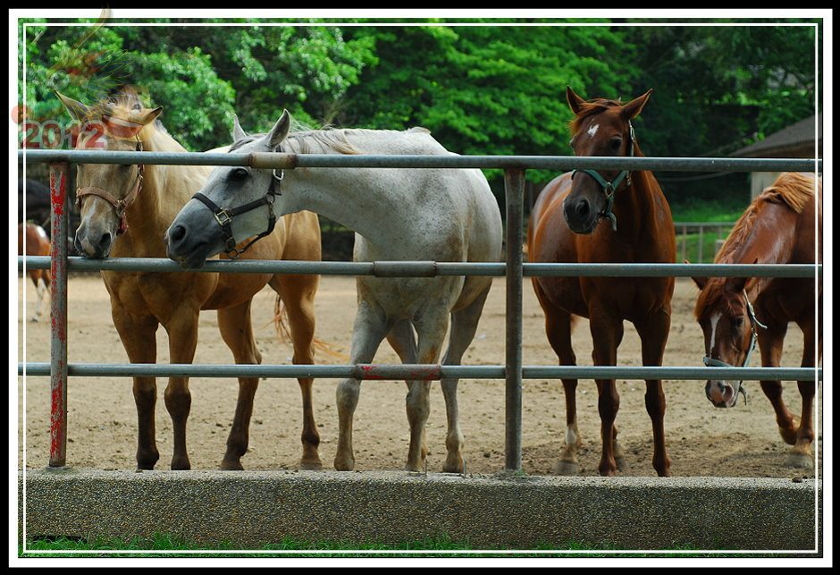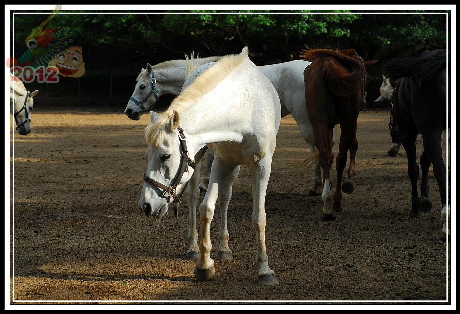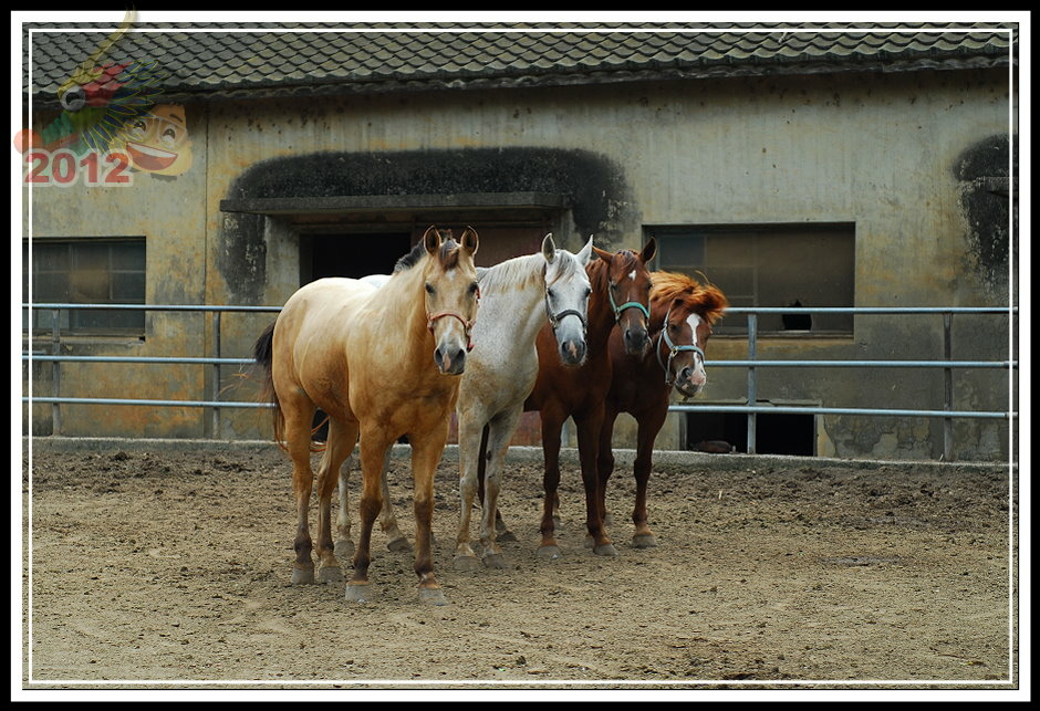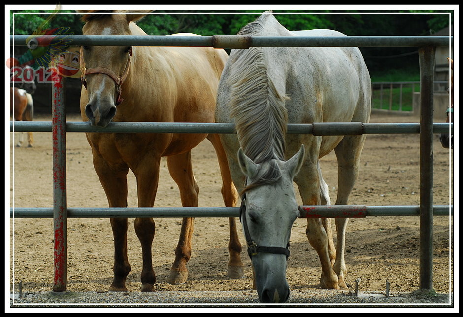 票房後面的小倉房不知道為什麼塌陷了屋頂沒有維修;原來為疾管局飼馬的園區被鐵皮圍籬圈住,高過人的高度一點也不客氣,偶爾可以聽見幾聲馬蹄傳過來。守住射箭場的先生吱吱嗚嗚,就只說園區租出去了,這邊的馬不屬於馬場;有段時間馬場有些吸引人氣的遊樂設施,的確也讓馬場在假日多了好些人氣,但這些設施都不見蹤影了。可愛動物區有幾隻鴨子;鐵皮圍籬旁邊有工讀生拉著馬載小朋友兜圈子;白色馬車停在馬場中間等待客人乘坐;最裡面的馬廄裡還有幾批馬,只要遊客走進欄杆,牠們立刻趨向前來溫馴地探出頭來。馬廄旁邊,幾匹健壯的馬等待著寥寥客人騎乘,大部分的時間只是被綁在欄杆旁不斷地跺腳晃動,忙著驅趕揮不去的馬蠅。