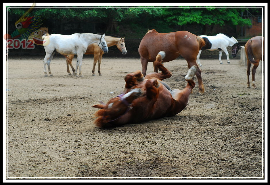 畫到四點,遊人似乎不再增加,馬夫們開始由園區各個角落「ㄍㄧ..ㄍ一..ㄎㄡ..ㄎㄡ..地讓馬兒下班回馬廄。知道馬一進到馬廄的第一件事是什麼嗎?不是喝水、不是食用草料...而是選一塊鬆土,躺下去打滾,四腳朝天地在大地上磨噌,大概要磨去背一整天馬鞍的不快、也想要趕去背上賴皮的馬蠅,那動作看來盡興...我似乎看見馬兒辛苦工作一天之後,終於露出一點放鬆的微笑。