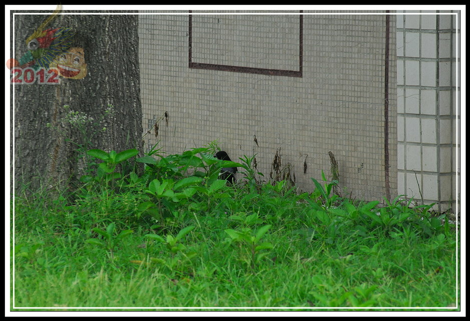 果然,黑白相間...遠看就像陸地上的虎鯨,遠遠地在草地上覓食。抓起相機迎面走上去,反正操場中間也沒有任何遮蔽物,趁著牠還沒回過神趕緊搶拍幾張。看我走進,喜鵲還飛到地上啄了蟲,過一會兒看著牠飛到圍牆外的鐵皮屋上。喜鵲一出現,校園裡的白頭翁、紅嘴黑鵯忽然都嘎嘎嘎地警戒起來,這會兒牠飛走,小鳥卻還嘎嘎個不停。直覺得...不對!樹上還有!繼續往樹上張望,果真一隻偌大的喜鵲竟然被紅嘴黑鵯追逐得落荒而逃,紅嘴黑鵯也真兇,有幾回還真的就在空中撲將上去。看著這紅嘴黑鵯為了捍衛領土竟然惡鬥猛禽,無奈地嘆氣...小傢伙壞了我的好事...怎麼不念在我平日對牠們還不薄的份上,多忍耐兩分鐘,要不就把喜鵲趕到我身邊來呢!