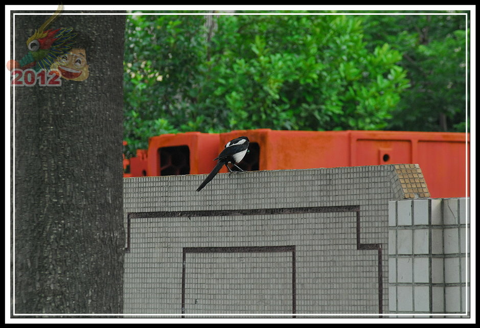 連這次,在豐原已經第三次與喜鵲錯身而過。第一次,在豐原大道疾馳,牠就站在路邊的鐵絲網圍欄上,等我回過神折返尋找,牠已經不知躲到何處?第二次,大正午時分就在火車站旁的空地上,也是站在傾圮的圍牆水泥柱上。我停車就與牠離一部車的距離,下車拿相機,牠就飛到附近大樓上面去了。第三次,也是今天早上,同事一進辦公室劈頭就問「那隻黑白相間的大鳥是什麼鳥?」我念頭一閃過...「該不會是....」。