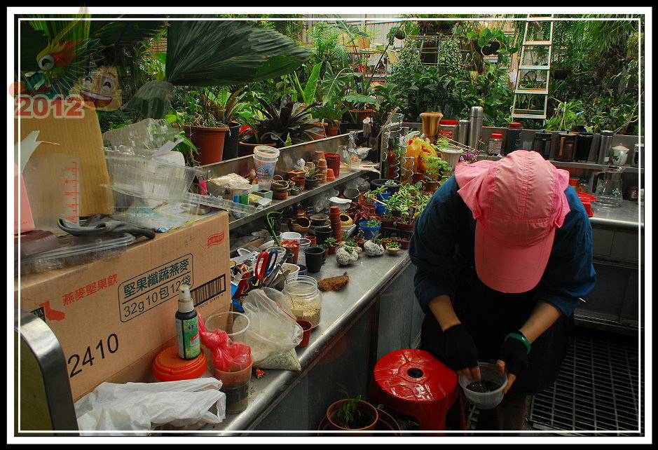 再往裡走去,店員就坐在吧檯後面工作,另一邊小姐也埋首將一小盆一小盆小品植物細心地移植到陶盆裡,她或許曾經抬頭關照過進來的客人,但她們應該知道...蹲下來細細品味每一個作品的人並不需要店員隨伺在側的解說,當他捨不得離去之際自然會高聲呼喚她們。