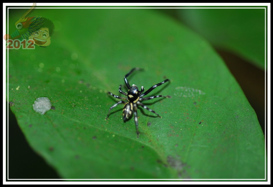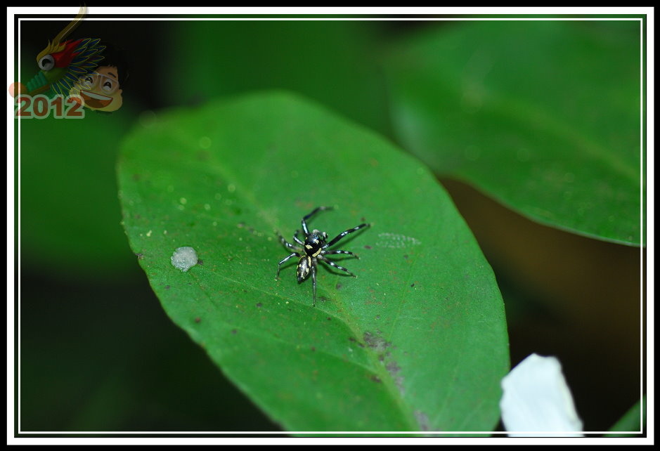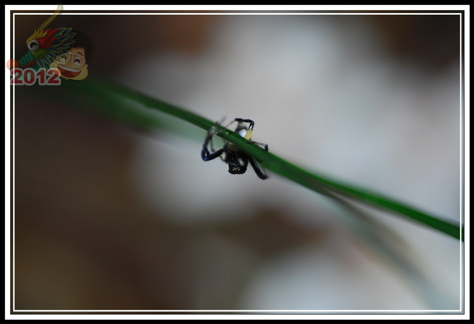 對人類而言,昆蟲世界似乎是無聲的,即便發出聲音,也因為個體太小而無法被人聽見。要發現昆蟲,只得睜大眼睛仔細地找,然後用儘量與牠們齊高的視角來取景。這隻雄直線黑條蠅虎活力十足,當我用閃光燈驚擾之後一直往林子身處躲去,逼得我伸手去將牠威嚇出來...最後還是輕輕地讓牠爬上手掌。不知道是手溫還是顏色干擾,牠一接觸就發足狂奔,幾次「高空彈跳」回地面。牠前肢與身體呈現誇張的比例,讓外形顯得更威武...也吸引我不斷地追攝。