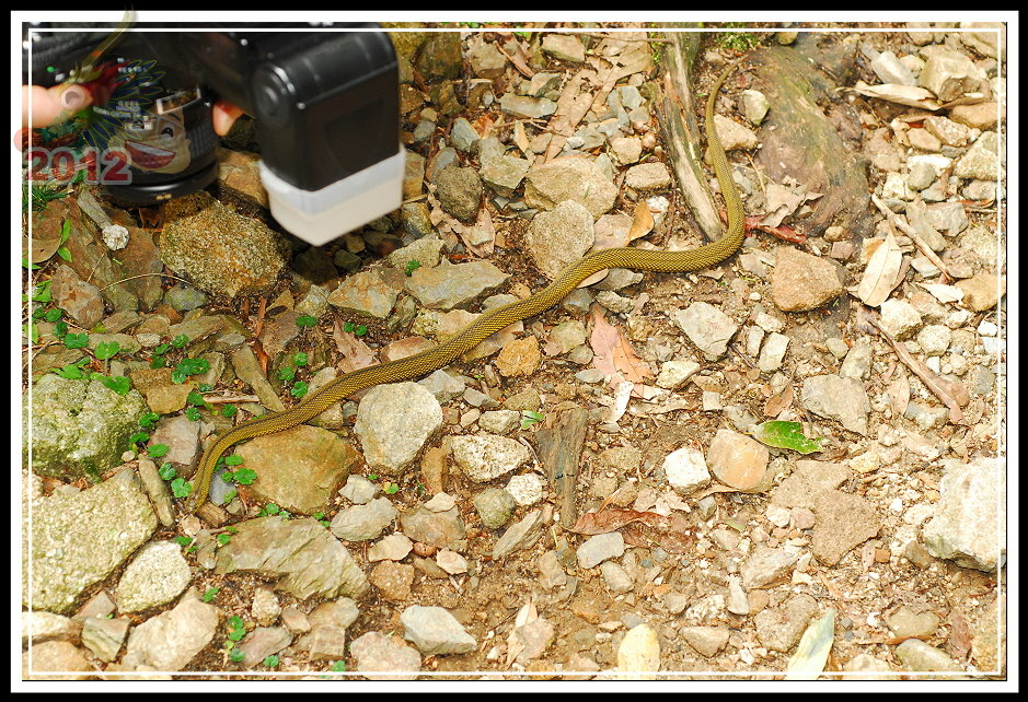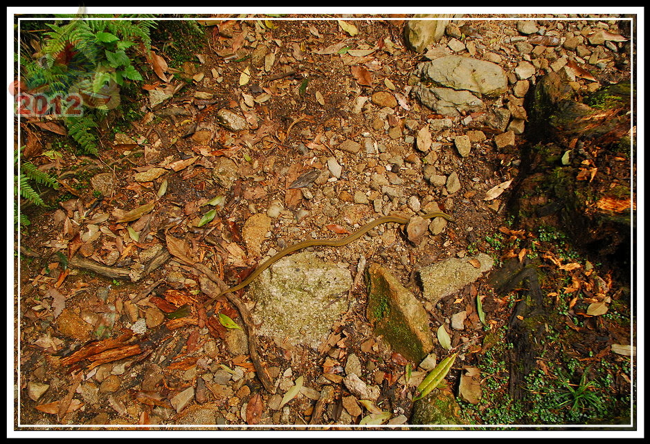 前面有一行人,所以走在稍來山步道時把心情放得很輕鬆,有什麼驚奇應該會有人會先打招呼;而且雖然走在最後頭容易被台灣黑熊追上,但笑話裡深具哲理:我只要保持隊伍中的倒數第二名就有百分之百安全的機會。因為下坡,所以視線是不住地在地面搜尋落腳處,利用腳尖去抵住樹根、石頭減緩衝力。不經意地反射...「哇!」叫了起來,怎麼有樹根會移動...緩慢地...而且就在我的左腳正要踏下處,連忙跳起來...接著叫「蛇...」。