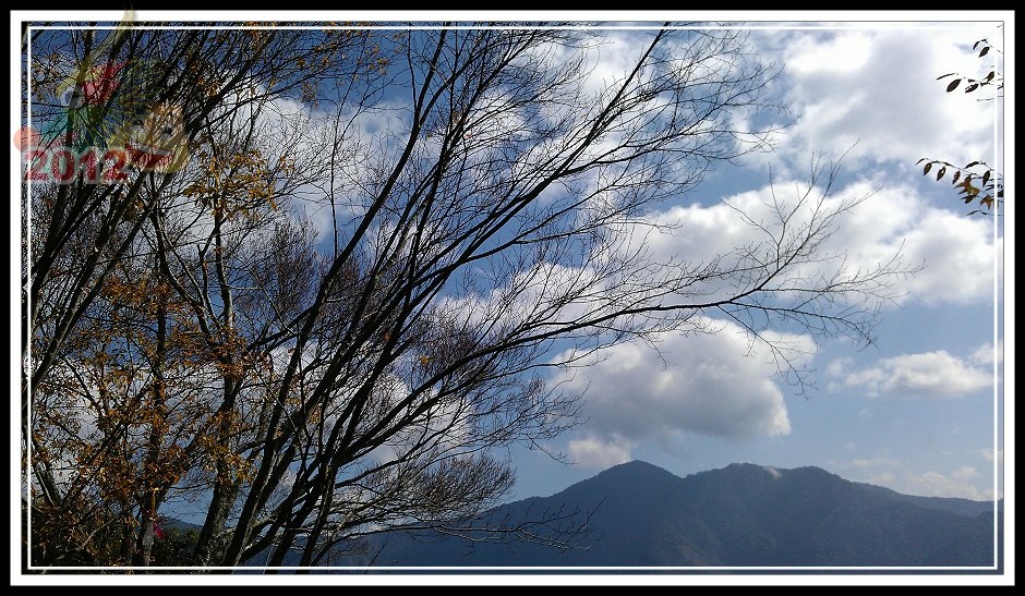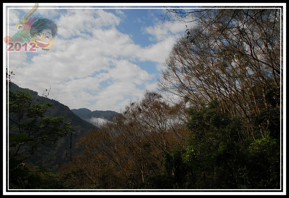 一路緩坡,我們過了登山口開始在櫸木林裡穿行,櫸木葉子落光了,僅剩下枯枝,樹幹上偶爾會發現「永久樣區」銘牌,純粹的櫸木人造林還真少見。邊走邊換鏡頭,也不時回頭...雲跑到山腰下,對面的山頭露臉了。