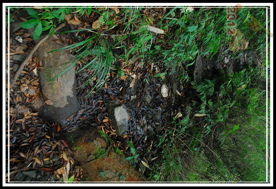 路有越來越陡、越來越險的趨勢,而且這山與谷關附近不同,踩在地上好似會出水一樣。走了一個鐘頭,遇見小山徑被山泉佔領,水還不是過馬路而已,沿著步道留了一段距離才往山澗落下...要是下雨天,這段路恐怕驚險。