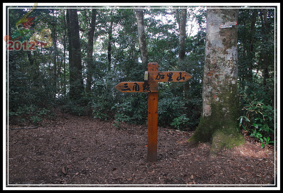 下午1點,終於看見指著三角點與加里山的叉路指標,在這之前辛苦地拉著繩子,最後這一段...真的光依賴繩子上山,有時候都不知道在何處落腳。指標上有好心人寫著「5分鐘」,而加里山則需要「4小時」。