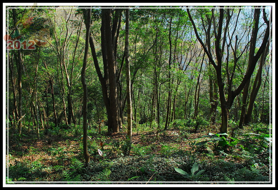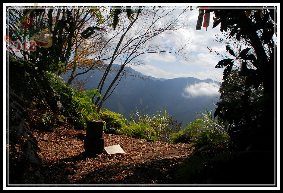 階梯頂是登山口叉路,右邊下切溪谷去「水雲瀑布」;左邊往「虎山」。才走3分鐘階梯,雲開了,汗也冒出來,於是開始將不必要的衣物夾在樹枝上...應該沒人會拿有汗臭味的衣服吧!