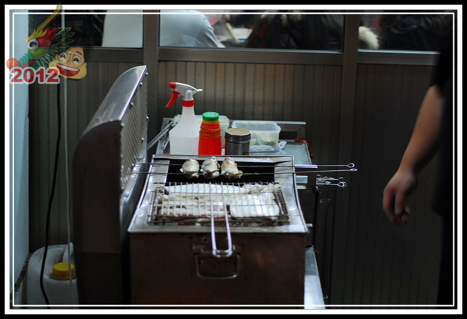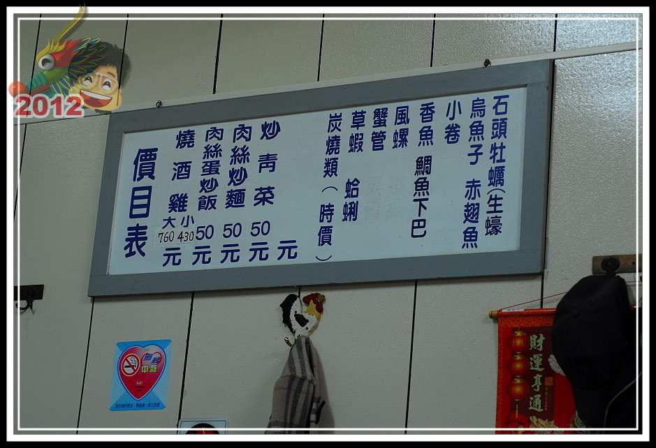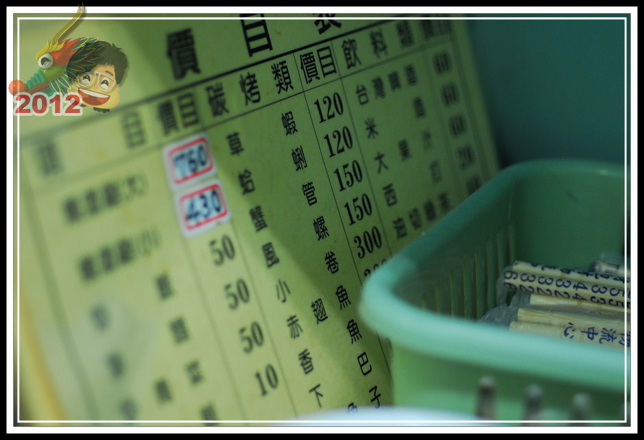 菜單掛在牆上,大鍋燒酒雞外,幾樣時蔬現炒,再來就是一長串烤物,花枝、牡蠣、蛤蜊...由兩位壯漢在門外架起篝火料理。寒流冬夜裡,才沒吃多少就已經滿頭大汗;面對如此菜色,我想夏天來杯冰啤酒,大概也是消暑良方吧!只是,一餐下來...操場不知道又要多跑幾圈了。