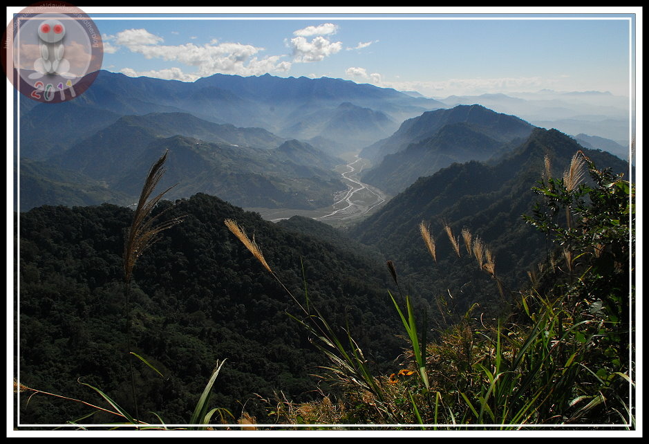 往南一點,大安溪峽谷在薄翳下方蜿蜒,與遠山層次分明得有點不真實。甚至可以眺見大安溪過了卓蘭之後往西流動的態勢,這是平日難得一見的。與大安溪隔個山脈,大甲溪今天也現身,再南一點,隱隱約約的新社台地也依稀可見,我知道今天那上面應該也因為花海而擠滿人潮。